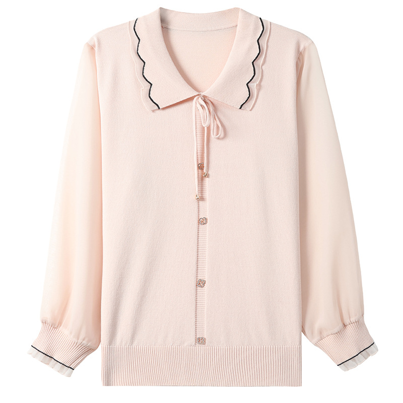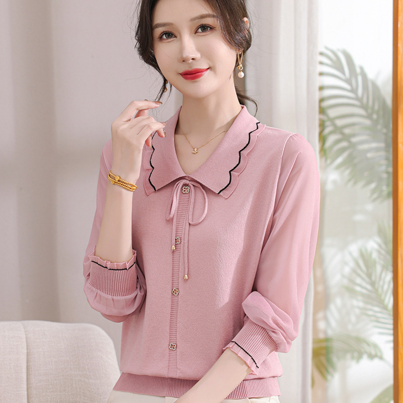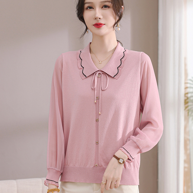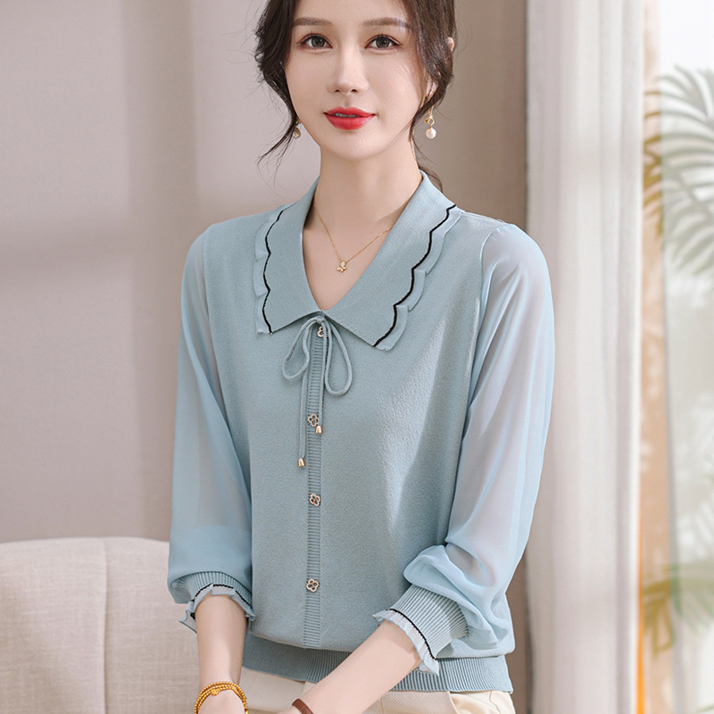 妈妈春装薄款纱袖T恤上衣洋气翻领打底小衫中老年女夏季冰丝长袖
