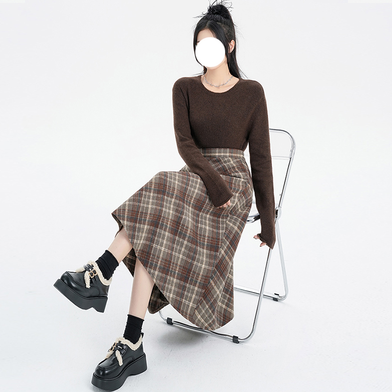 大码复古毛呢格子半身裙女秋冬高腰显瘦小个子遮胯A字伞裙中长裙