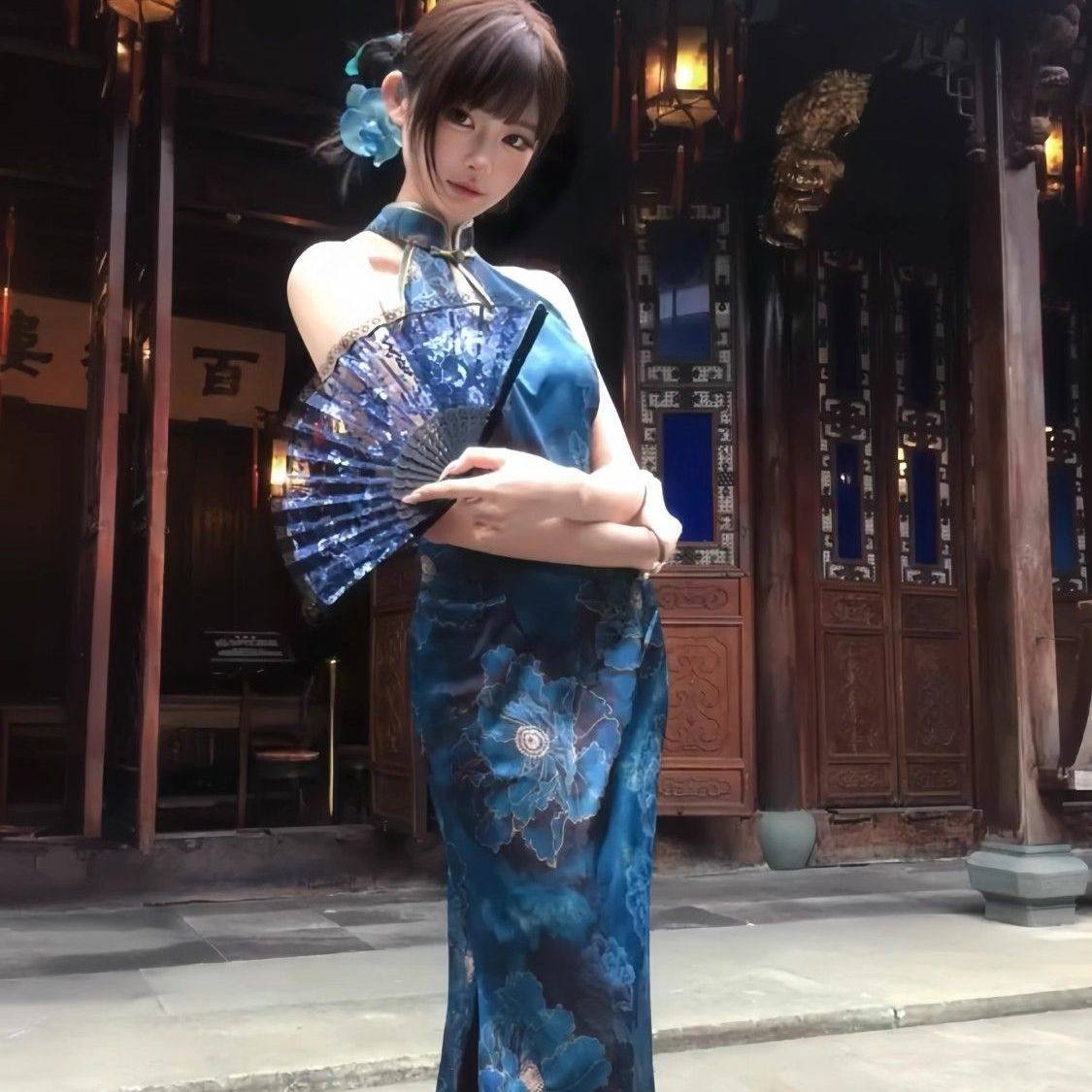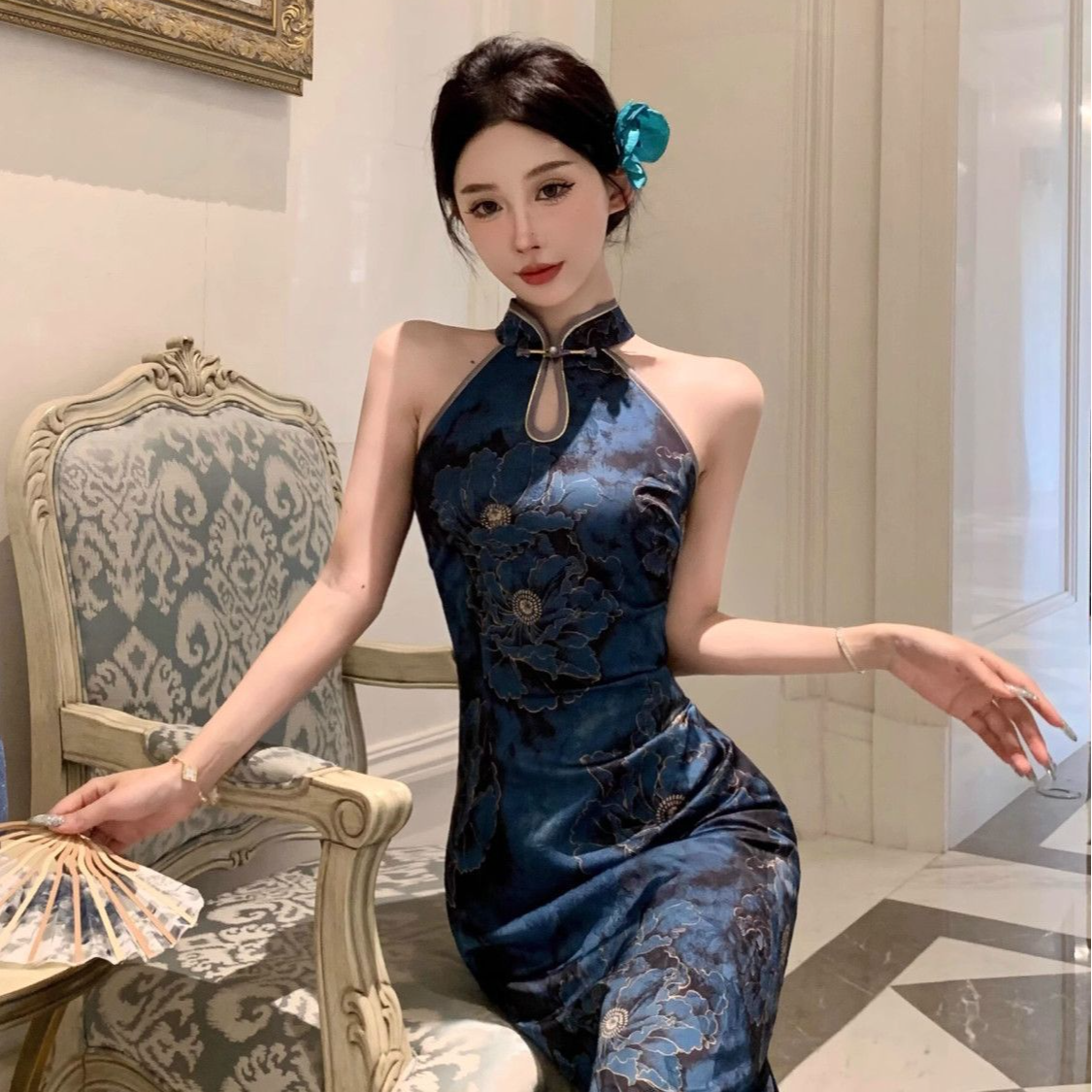 新中式名媛优雅复古印花开叉改良旗袍连衣裙开叉无袖盘扣连衣裙女