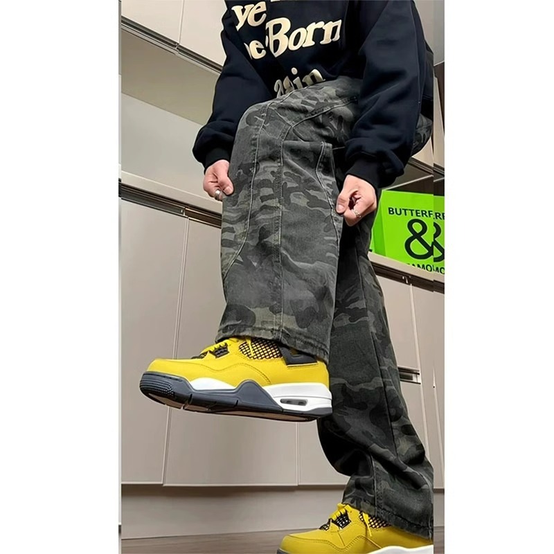 军绿色高街复古迷彩裤男春秋新款宽松高级感伐木工装直筒牛仔裤子
