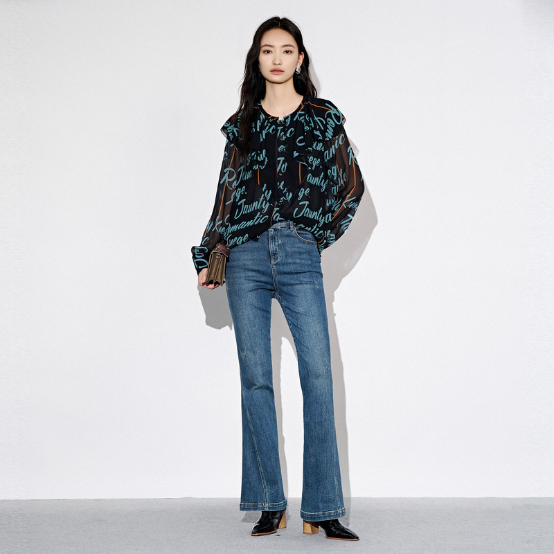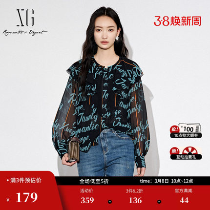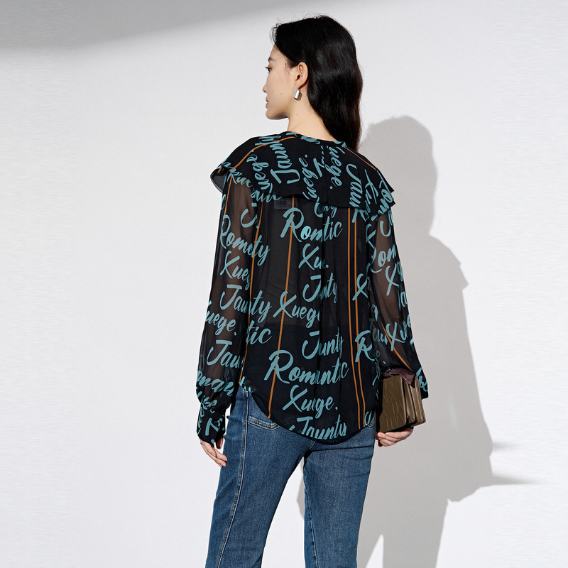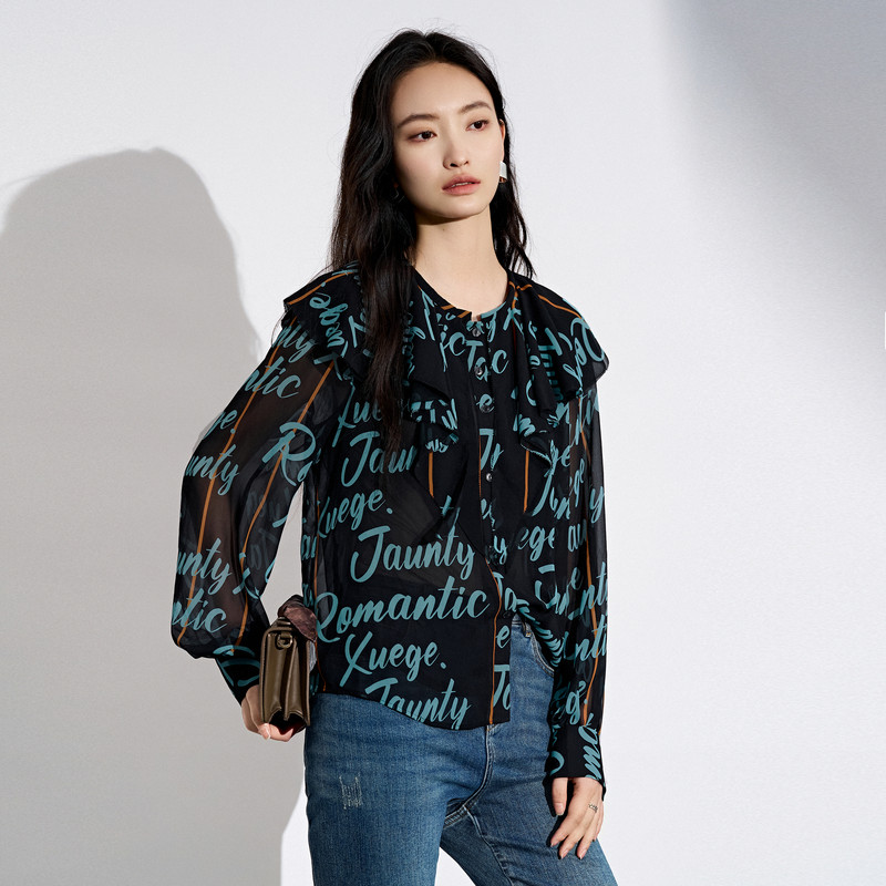 XG雪歌满版字母印花长袖衬衫时尚秋季新款通勤荷叶领设计上衣女装