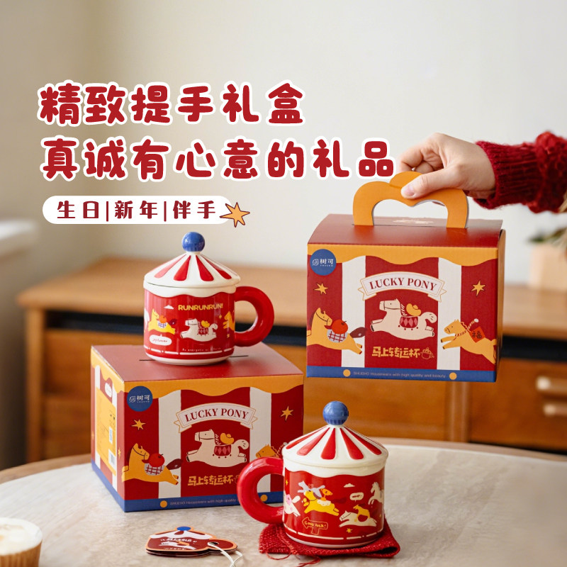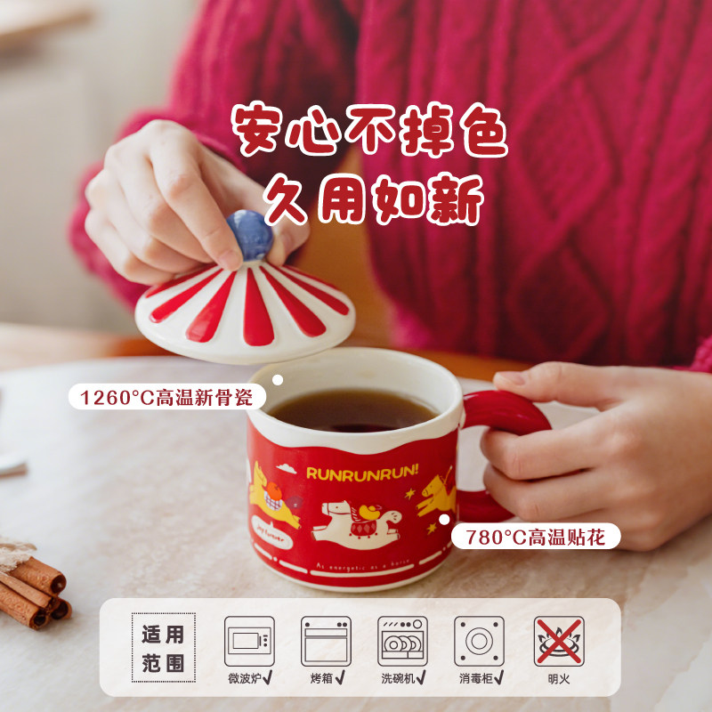 树可马上转运杯陶瓷水杯家用喝水漂亮高颜值带盖红色马年马克杯子