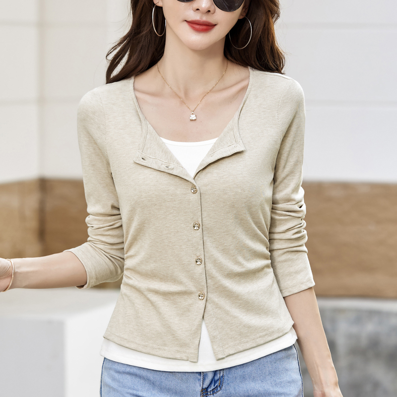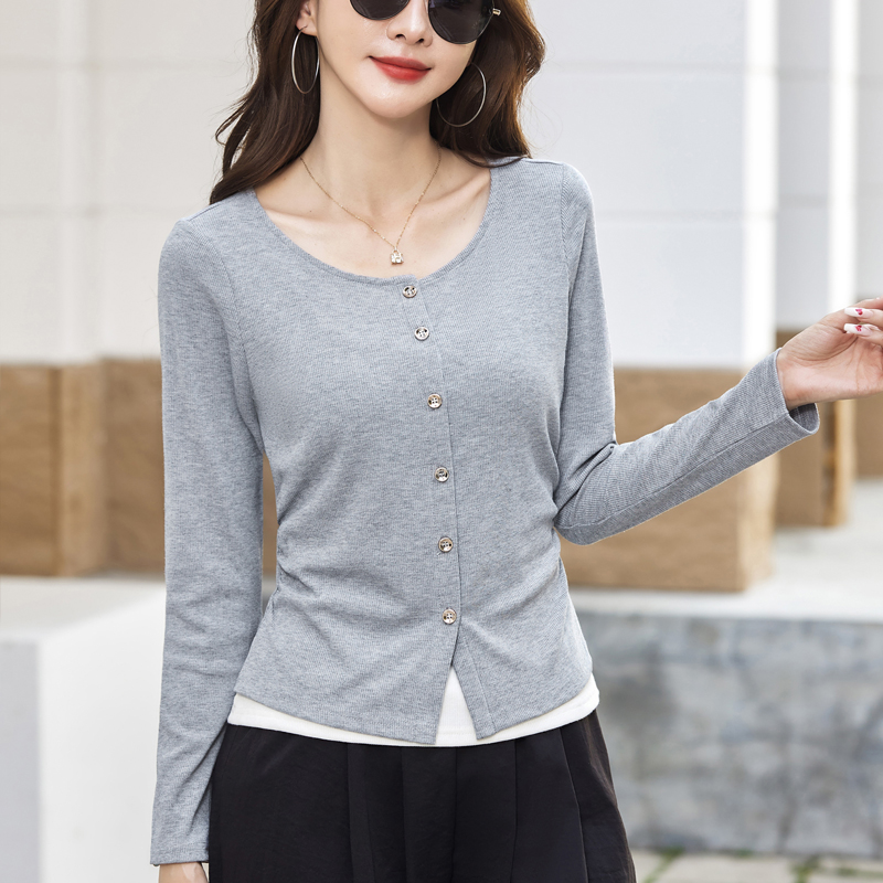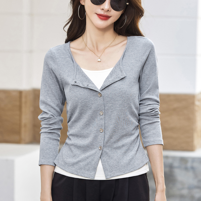 灰色v领假两件长袖T恤女针织衫春秋季短款上衣打底开衫薄外套上衣
