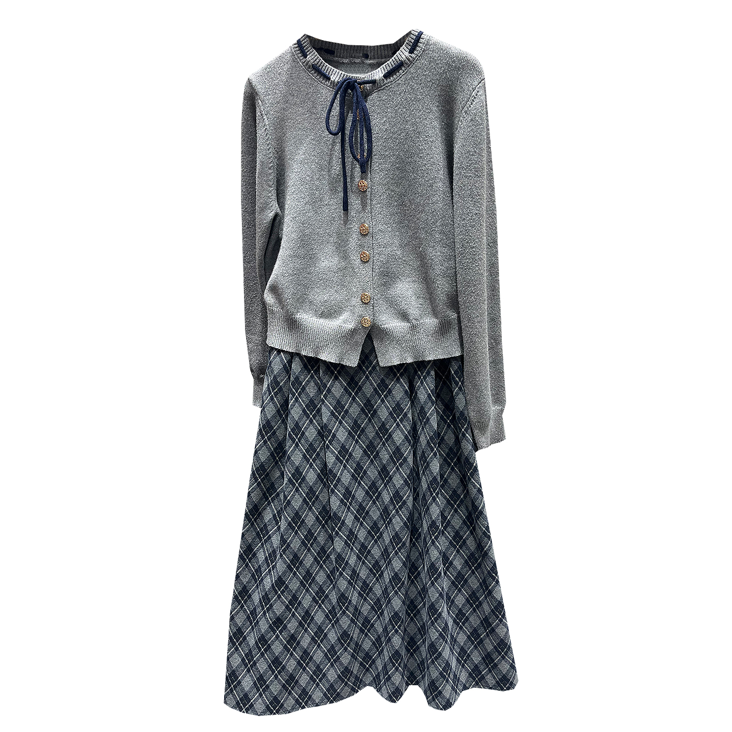 开衫毛衫+格纹磨毛半身裙两件套女2025秋季针织衫格子薄妮子套装
