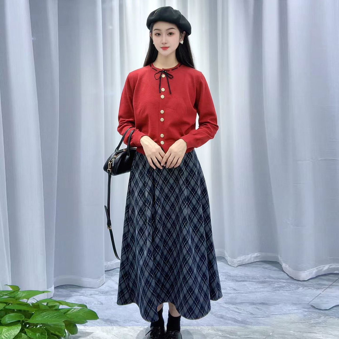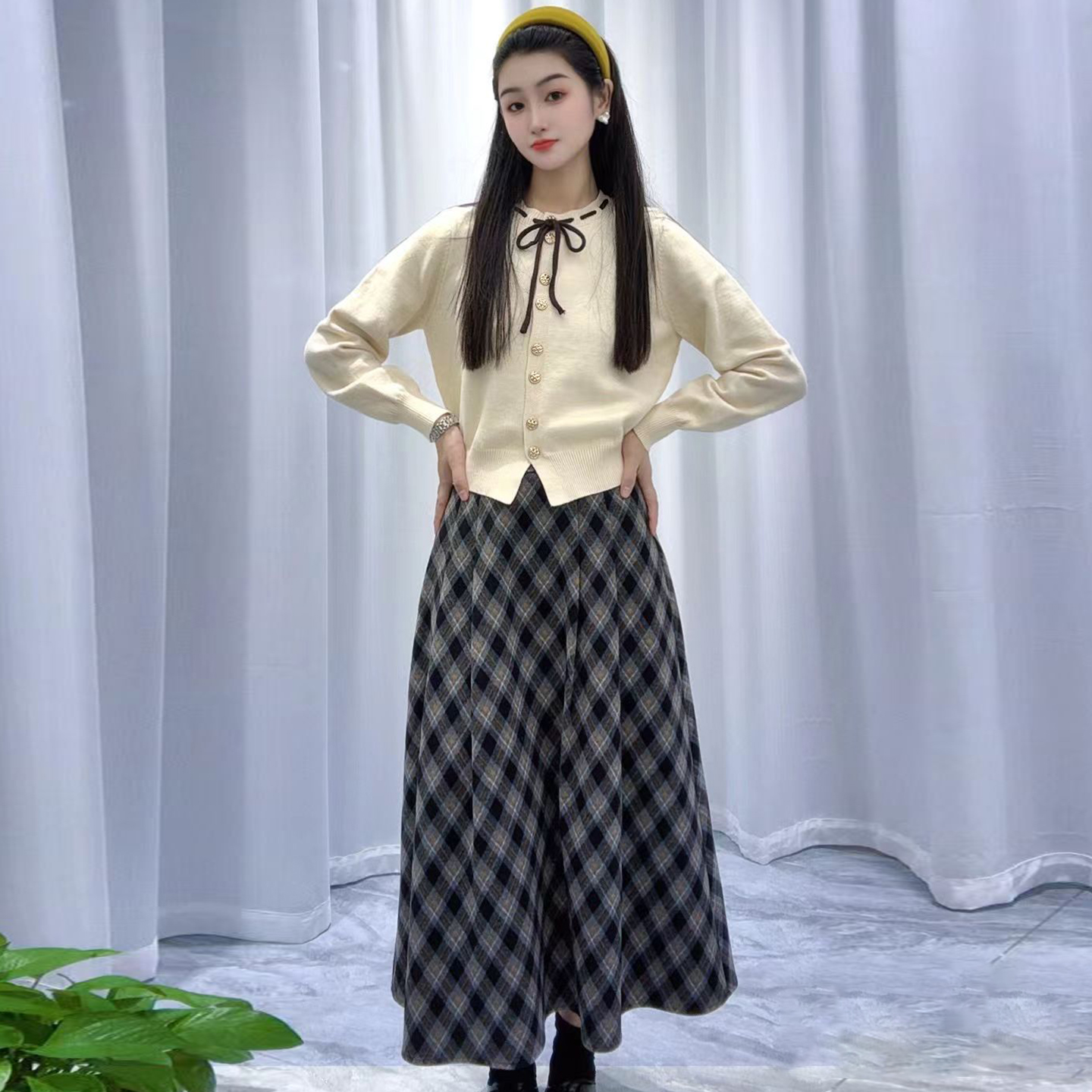 开衫毛衫+格纹磨毛半身裙两件套