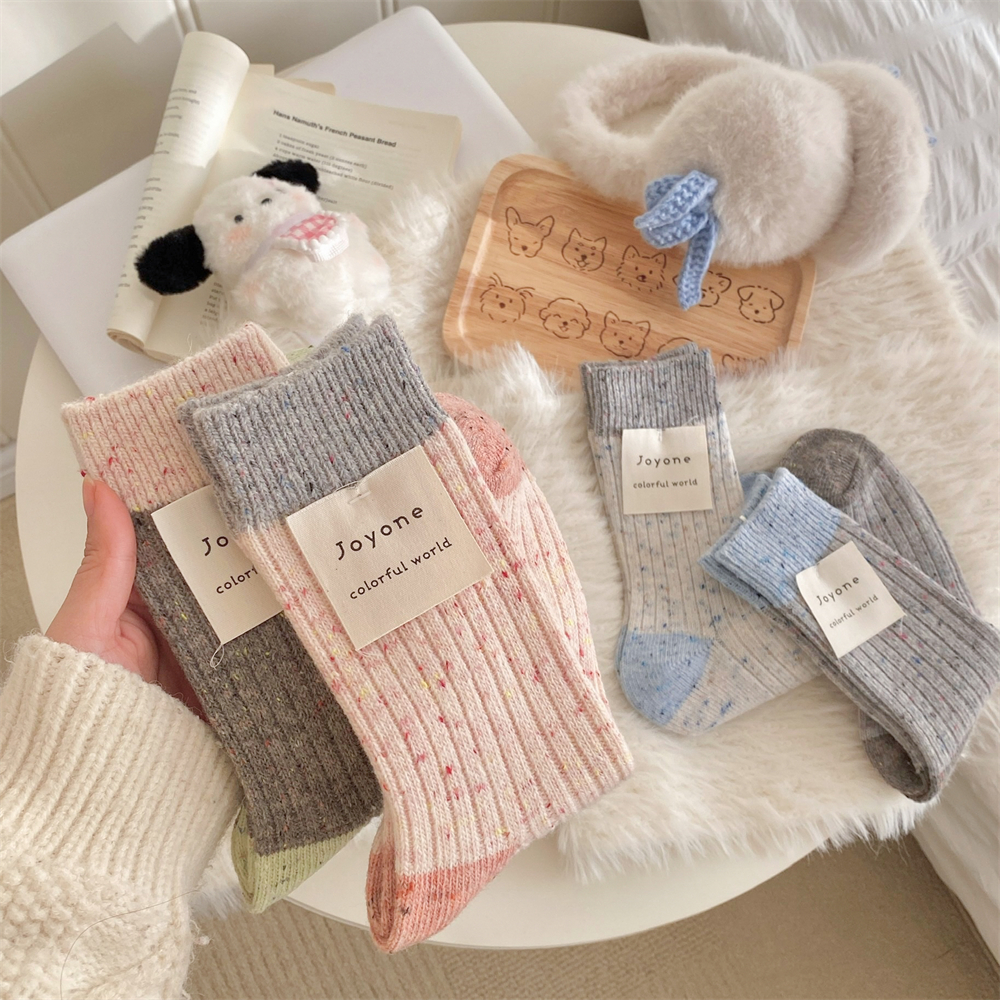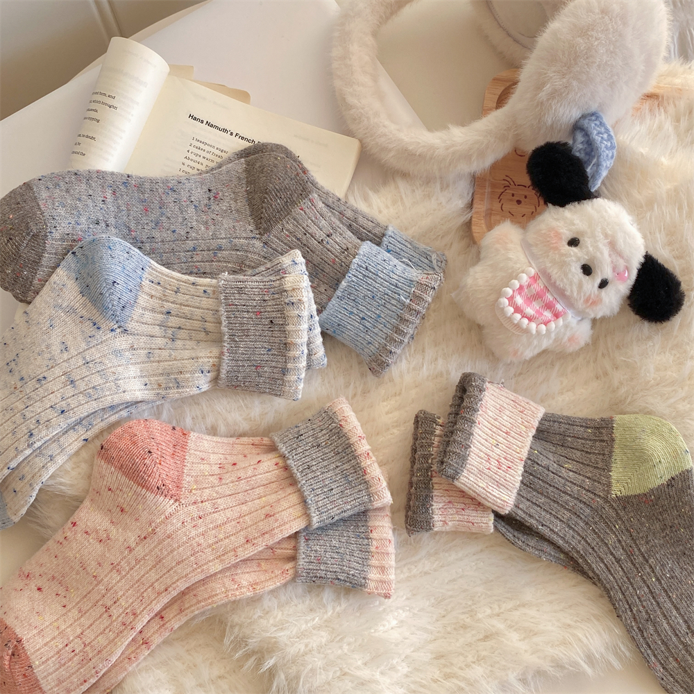 韩版含羊毛点子纱中筒袜灰蓝奶盐堆堆袜撞色拼接加厚保暖长袜子女