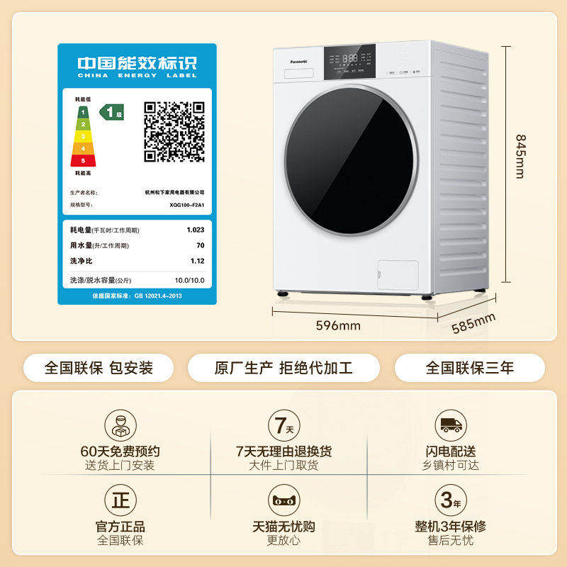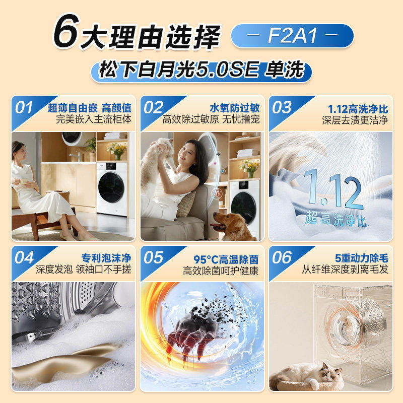 [超薄全嵌]松下白月光5.0se洗衣机10KG滚筒全自动除菌变频F2A1