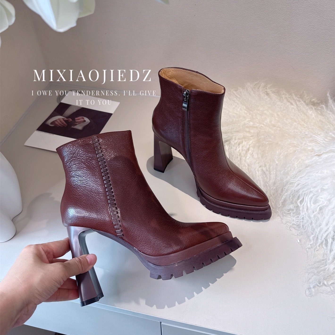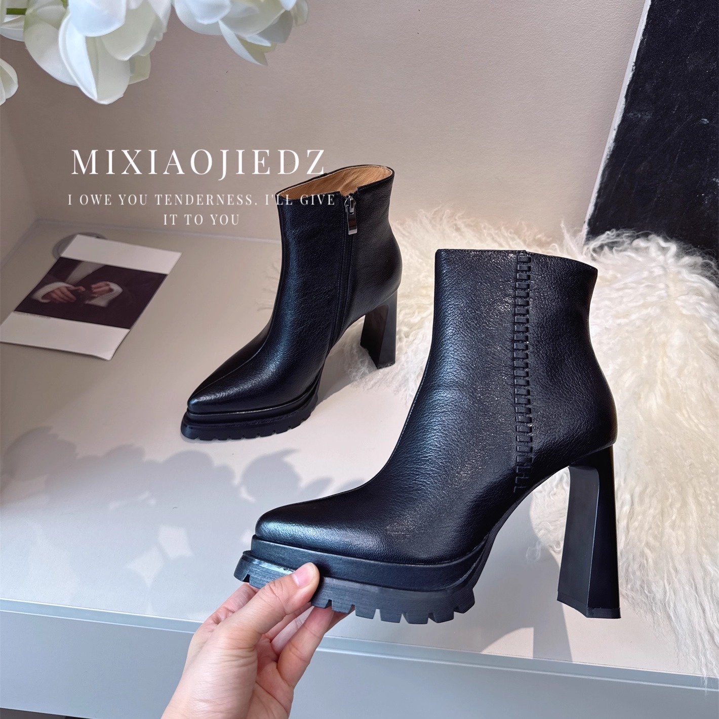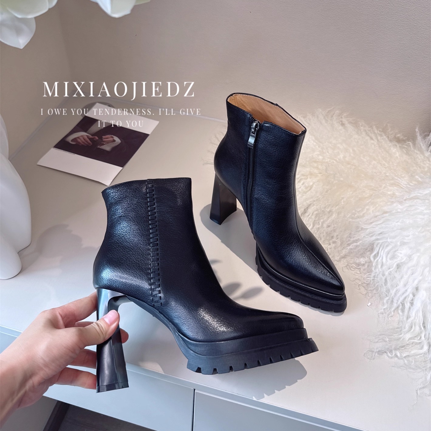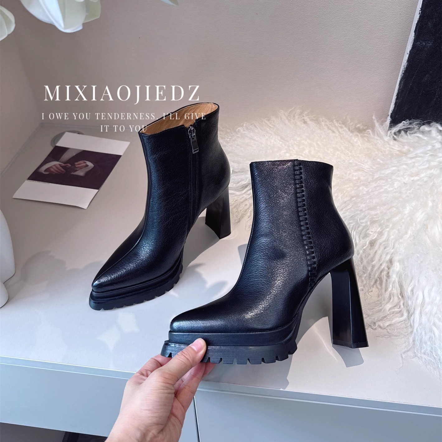 秋冬鞋子女2025新款爆款女鞋黑色真皮粗跟高跟防水台气质尖头短靴