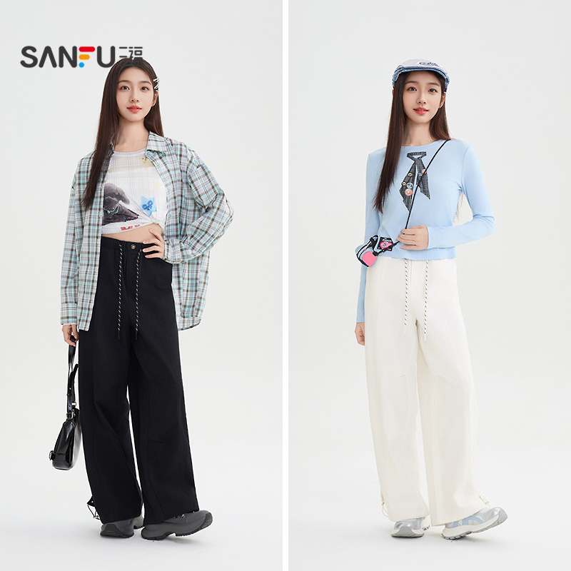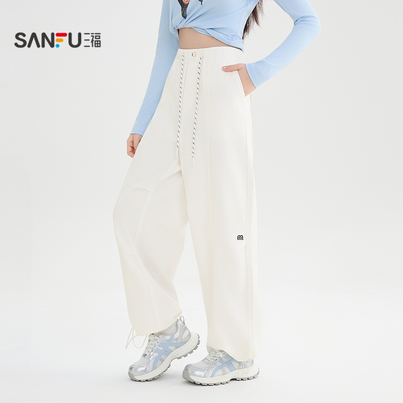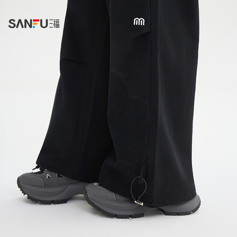 #三福休闲裤2025秋季字母刺绣打褶宽松工装裤长裤女装508064