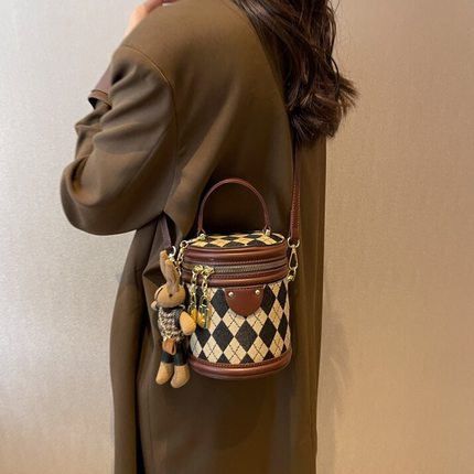 女包圆筒包2025新款时尚小众复古级质感菱格斜跨肩手提水桶包