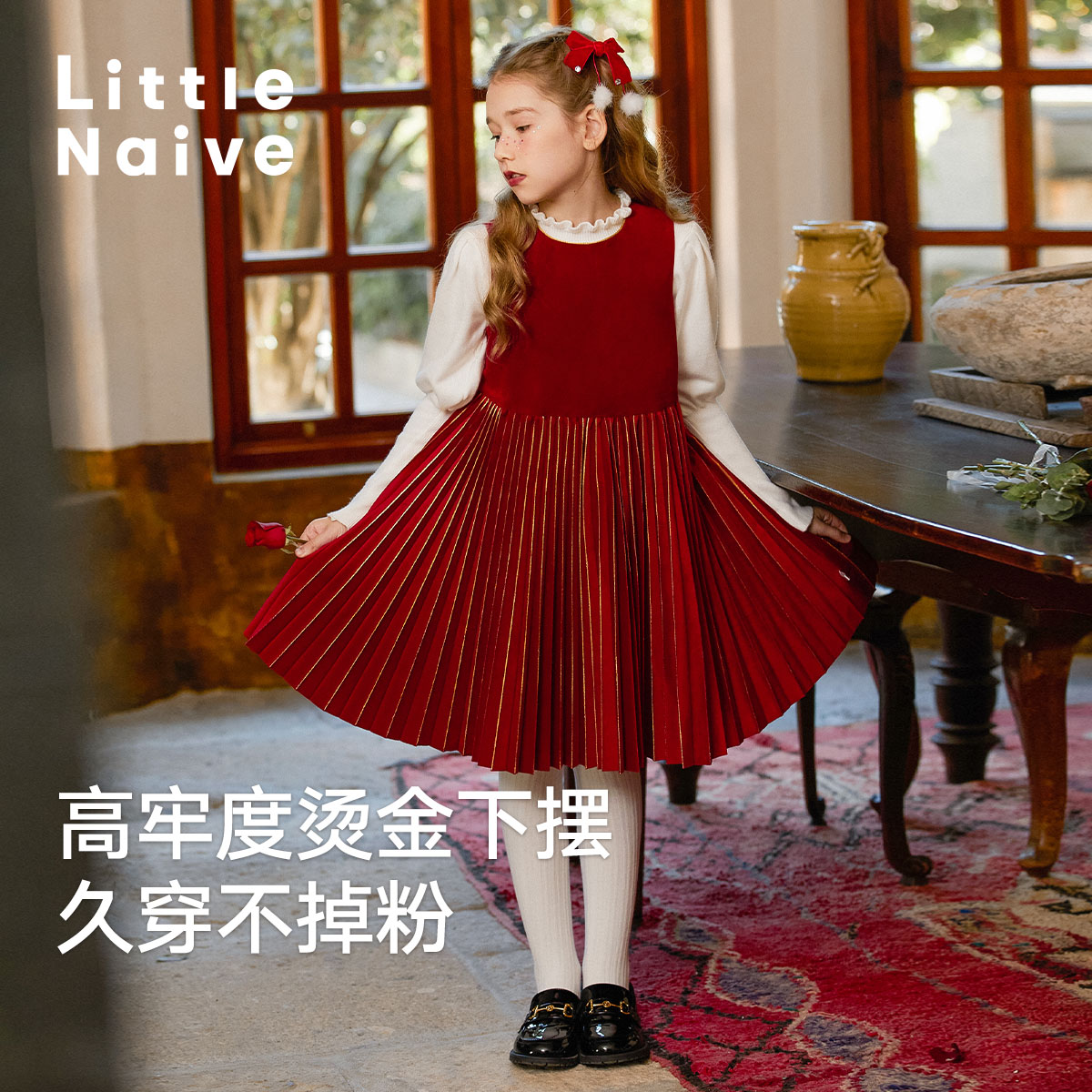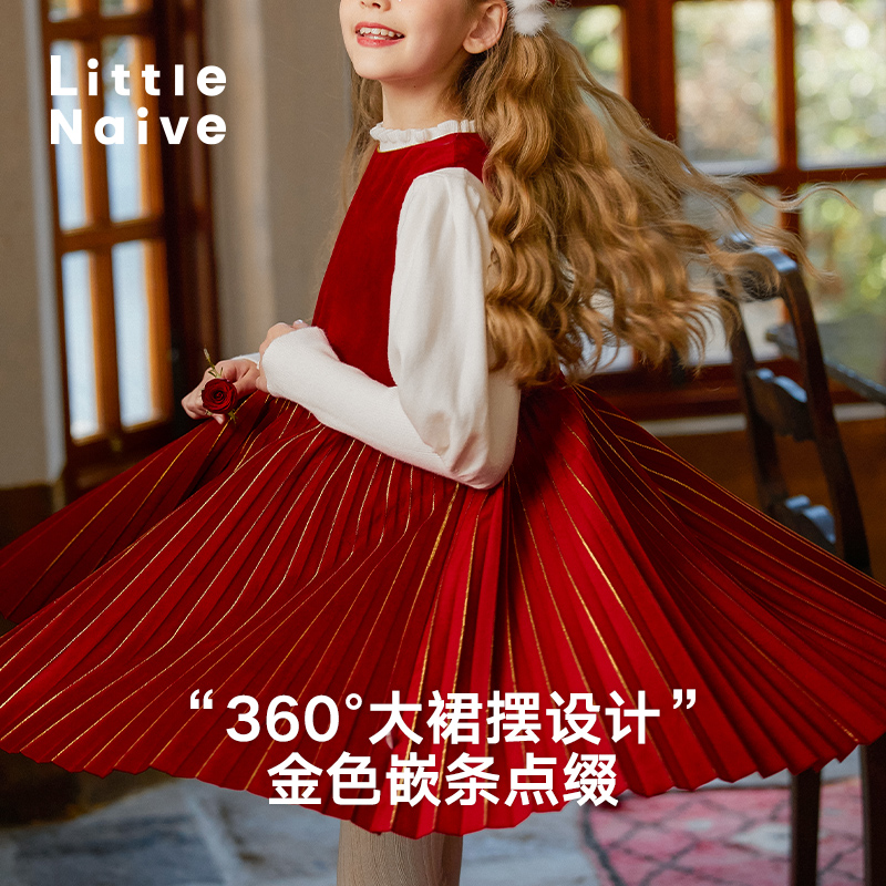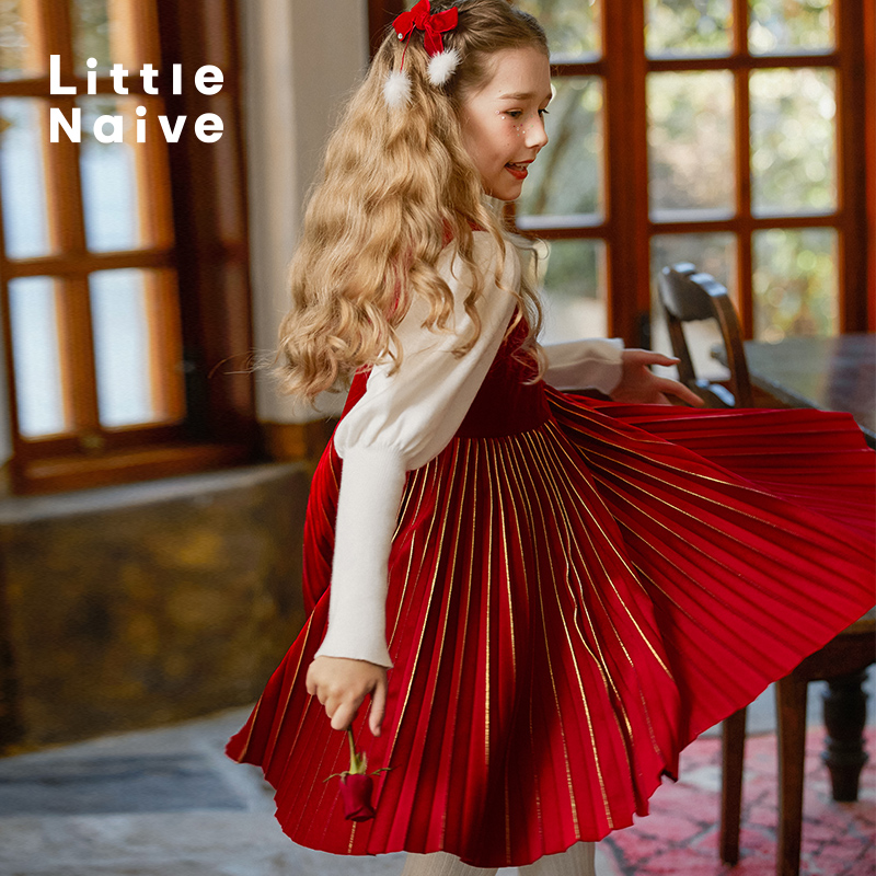 LittleNaive 秋冬季女童百褶背心裙红色礼服裙儿童烫金节日连衣裙