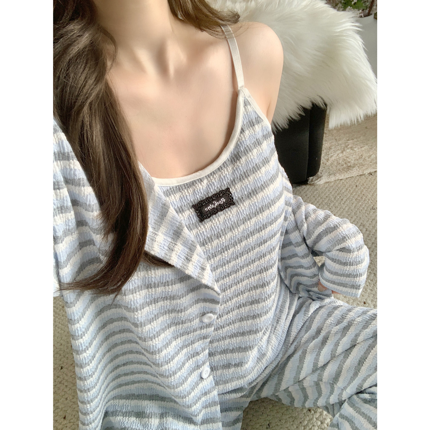 性感条纹睡衣女款春秋季2025新款甜美带胸垫吊带长袖三件套家居服