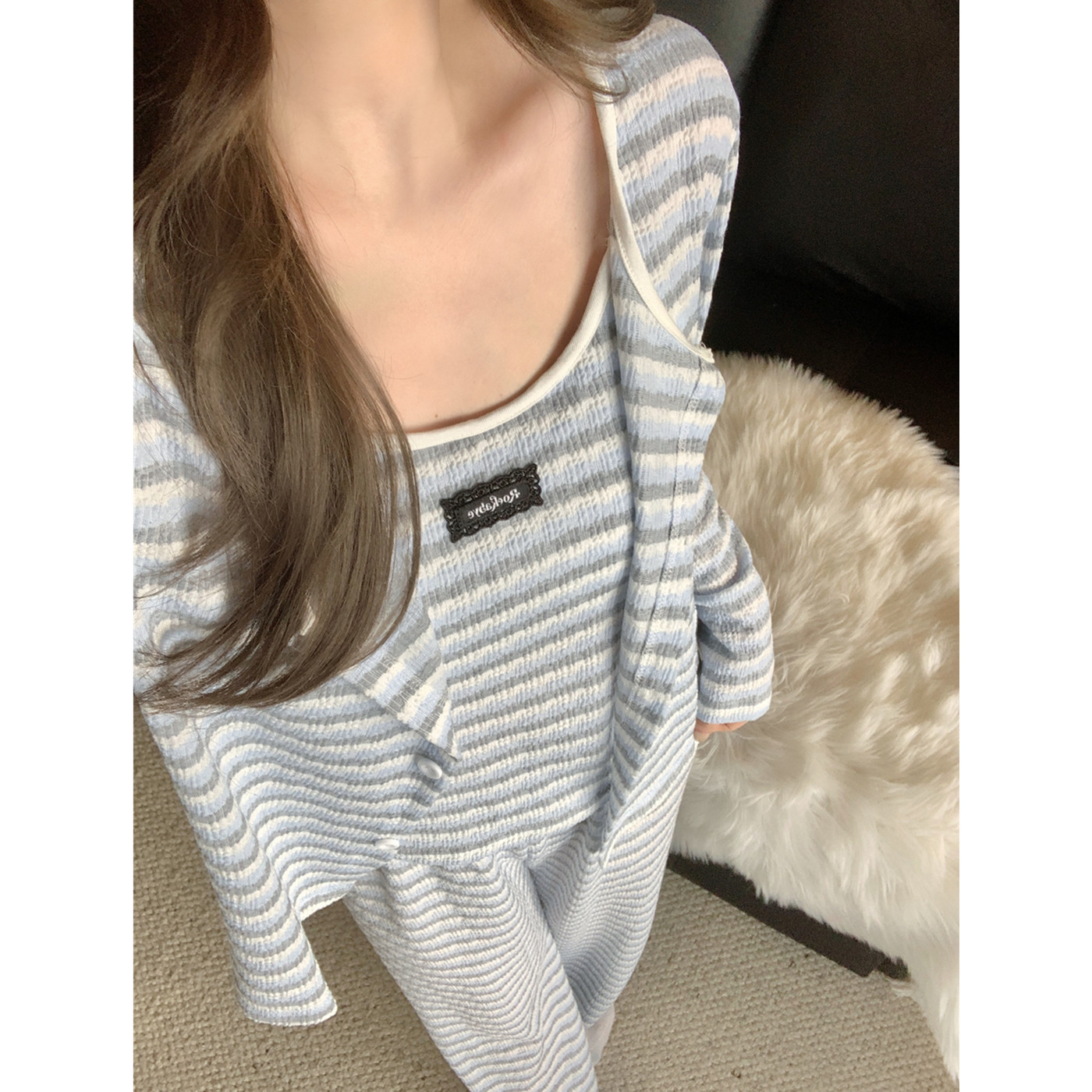 条纹睡衣女春秋带胸垫长袖三件套