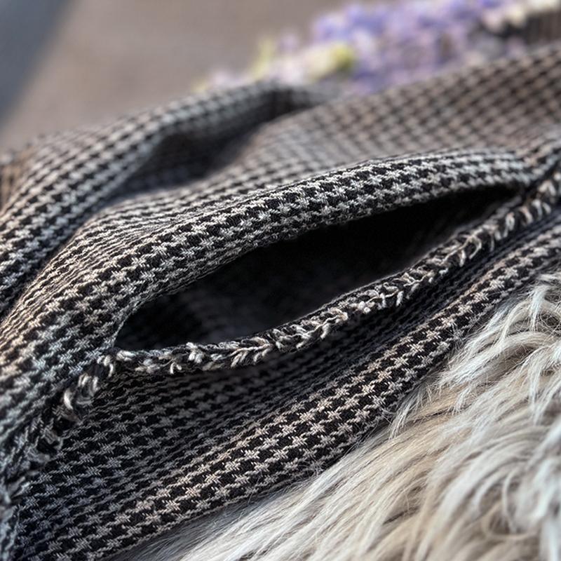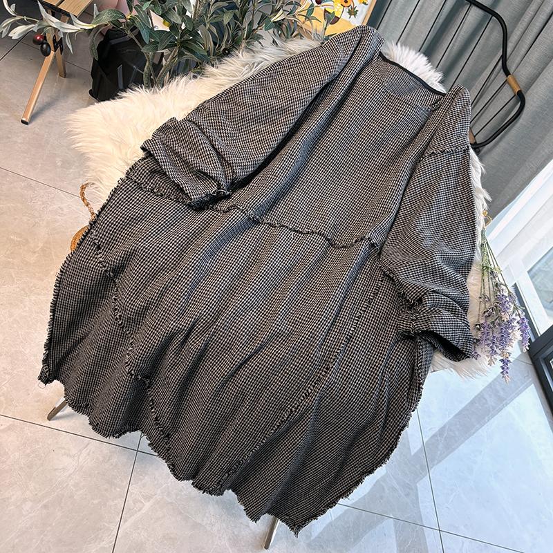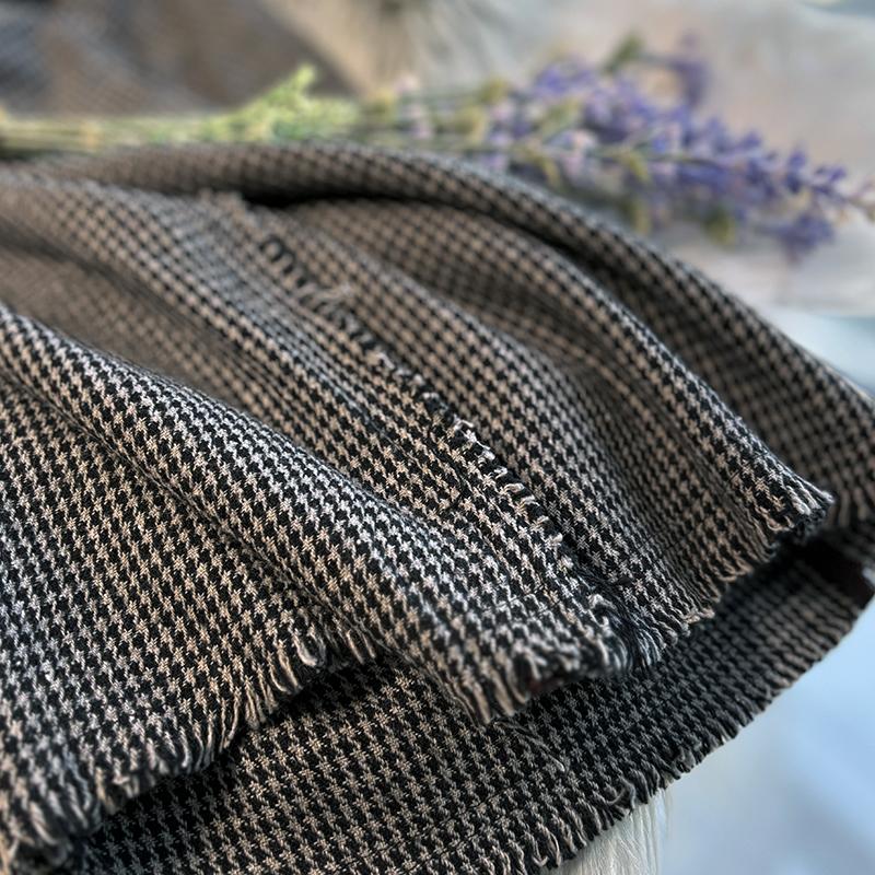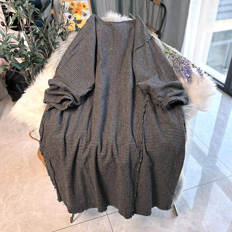 原创棉麻春秋文艺复古千鸟格子毛边长袖宽松中长袍子连衣裙大码女