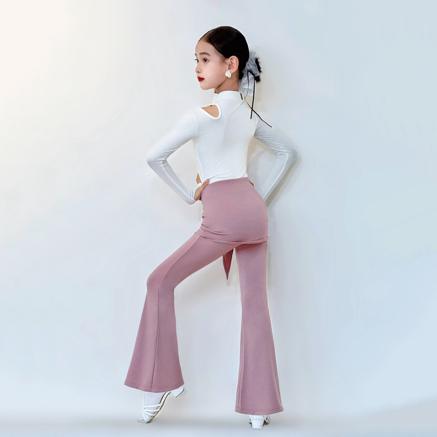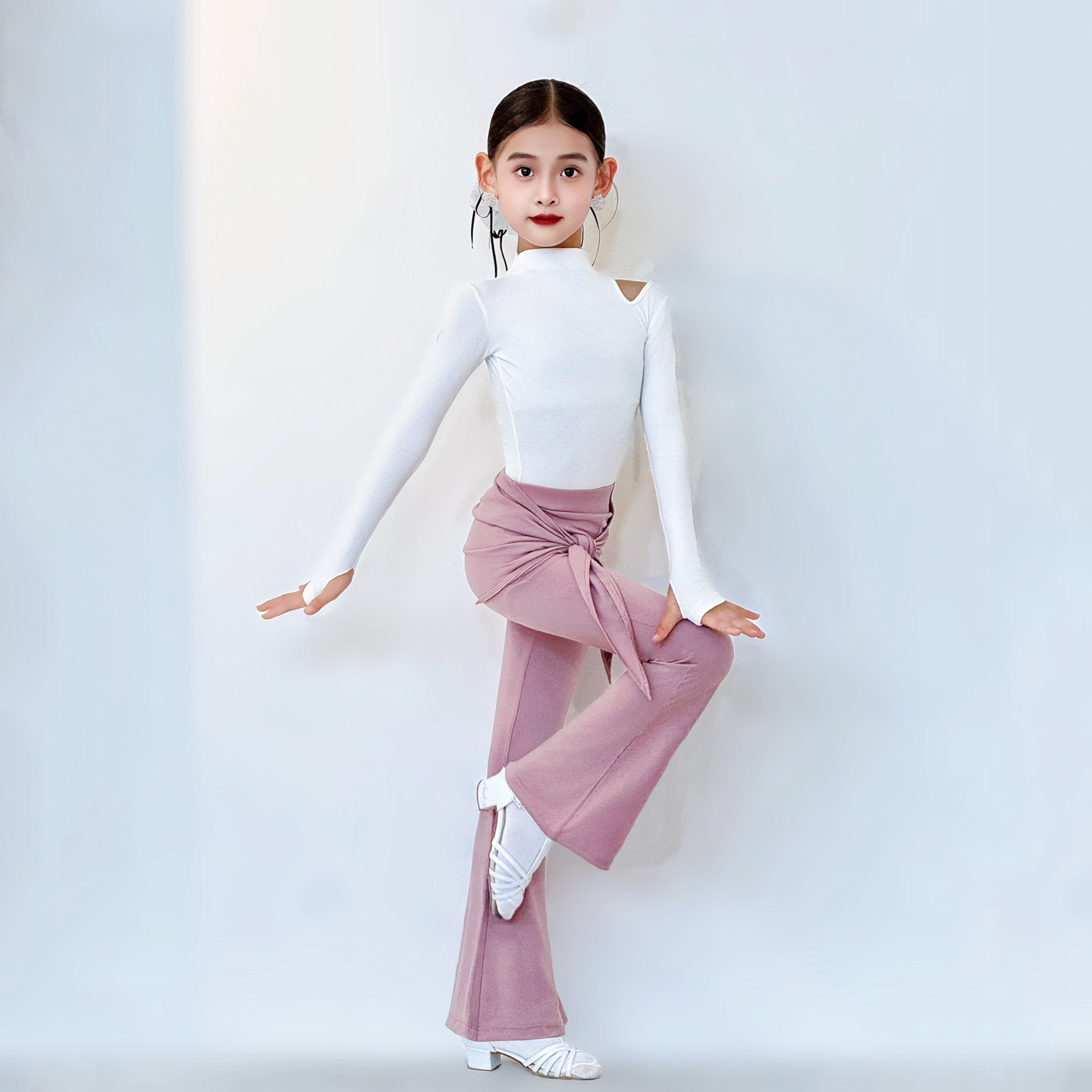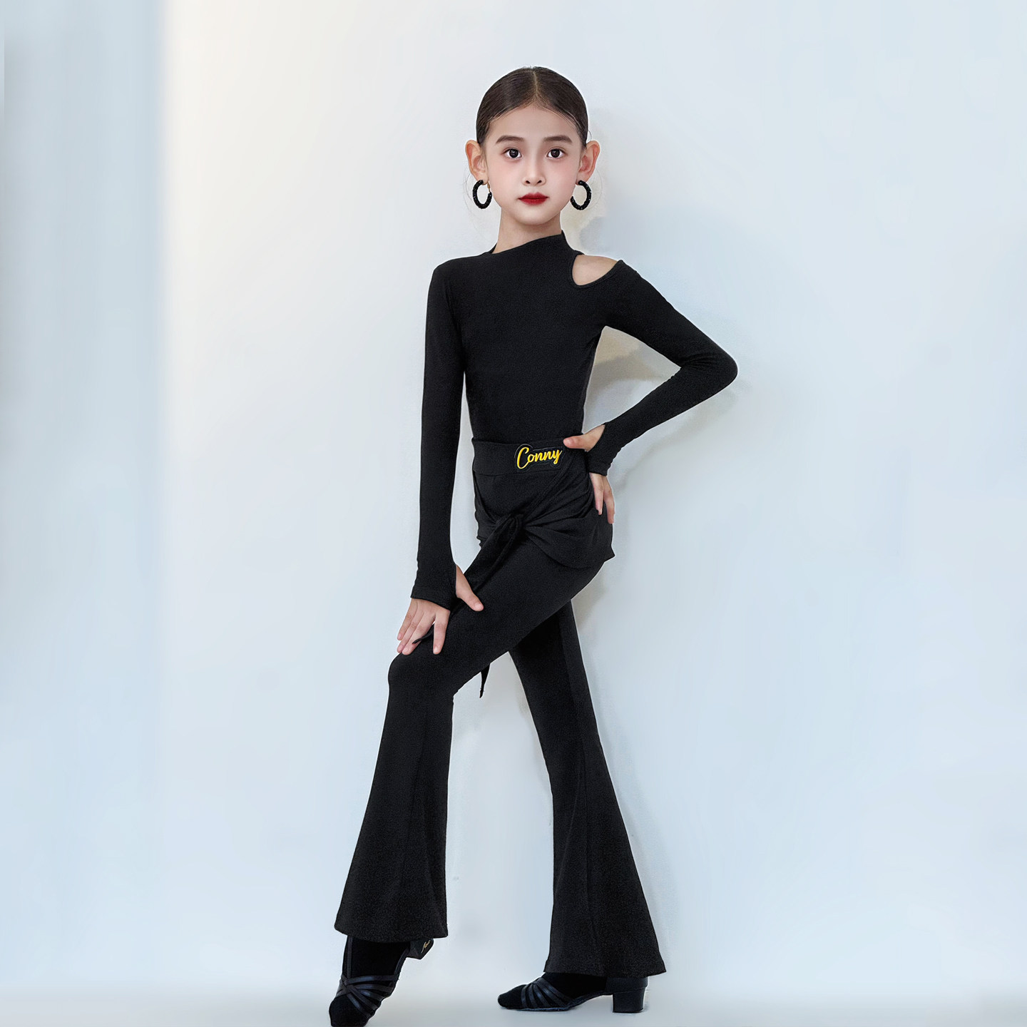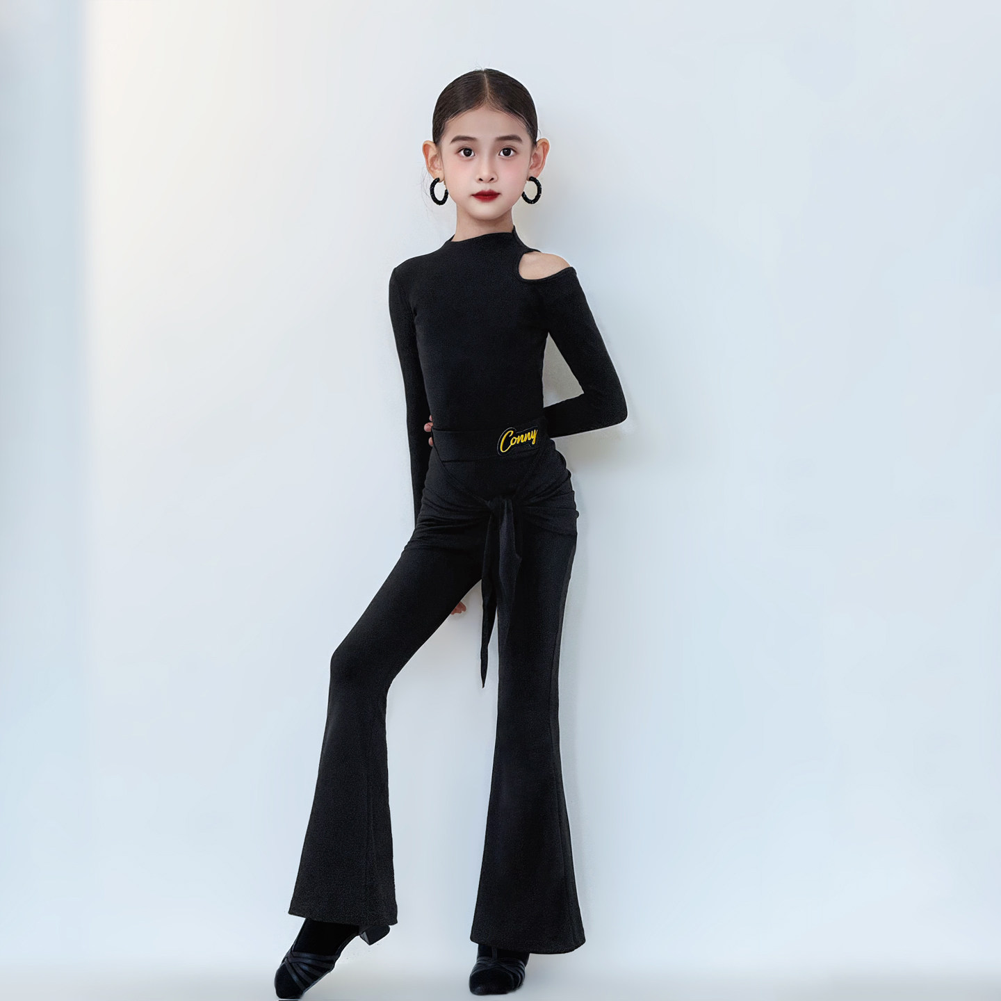 CONNY拉丁舞训练服女儿童舞蹈练功服长裤微喇叭黑色长袖上衣套装
