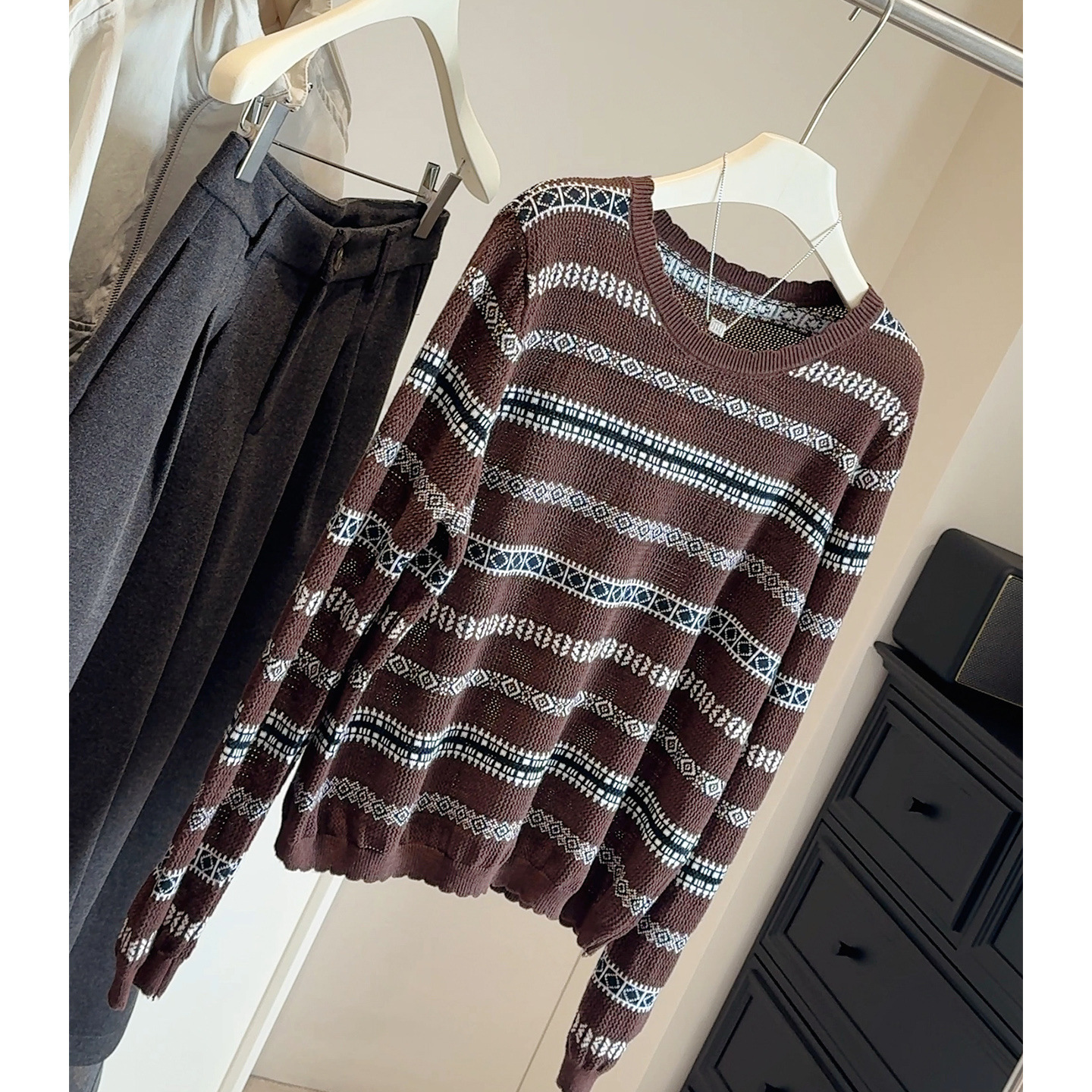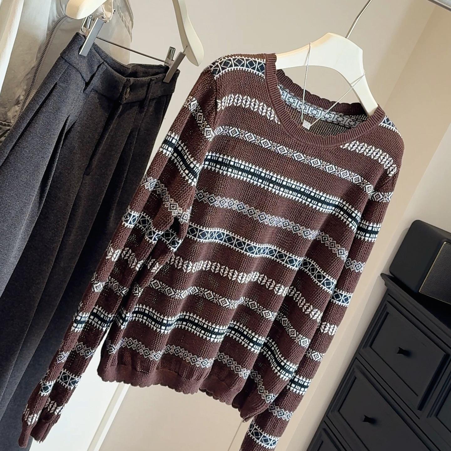 撞色条纹提花长袖针织衫女打底秋季新款宽松显瘦百搭洋气圆领毛衣