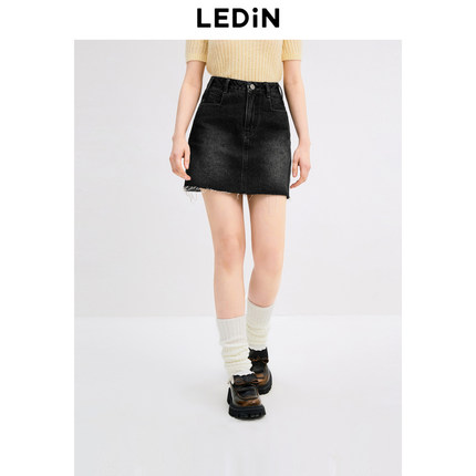 乐町黑色水洗牛仔半裙秋季马骝喷色A字挤基础毛边短裙