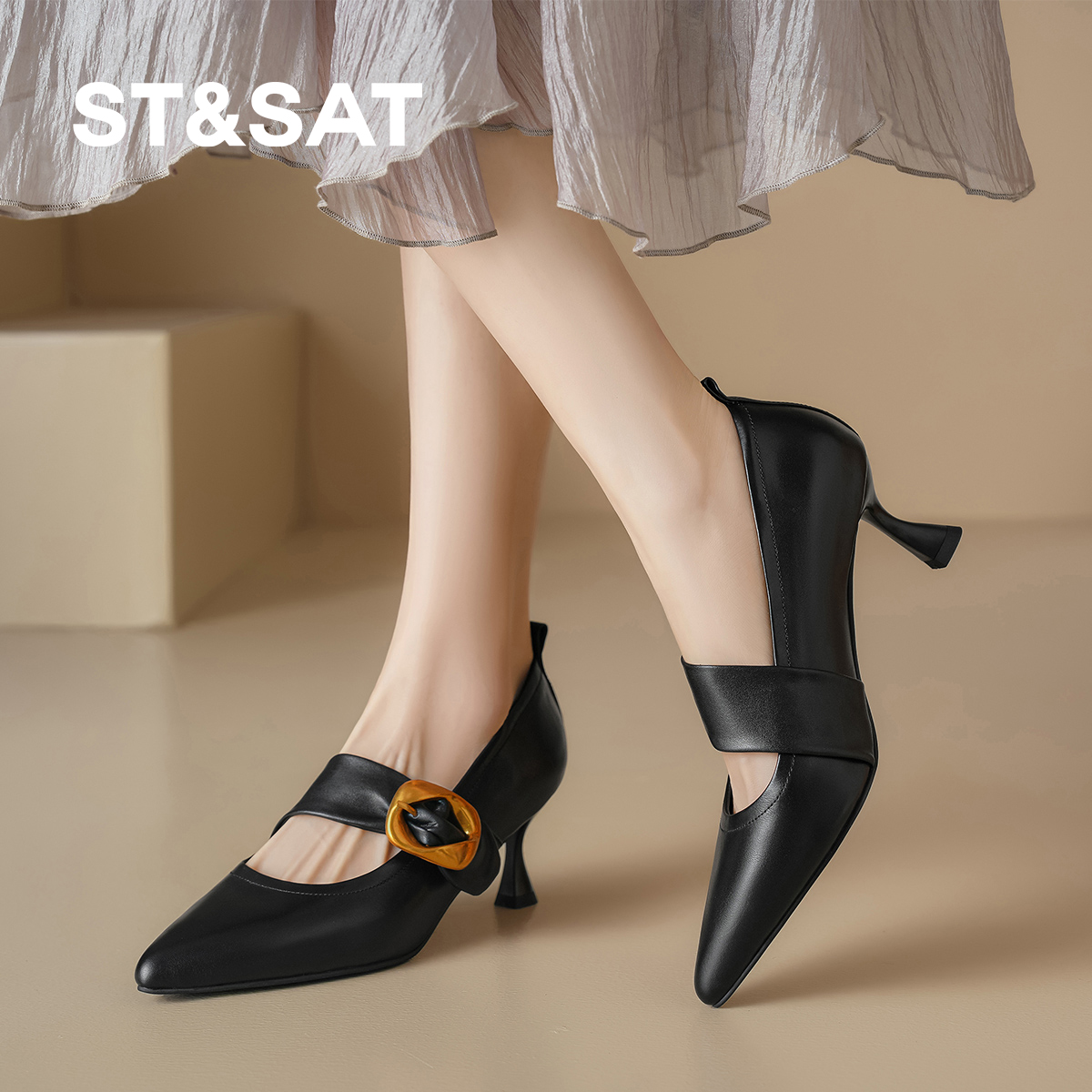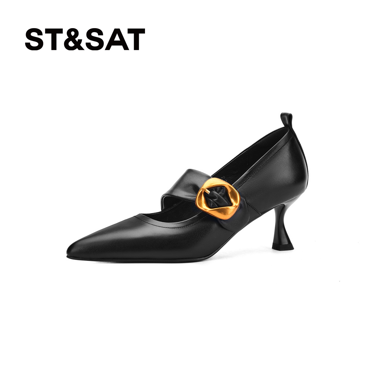 星期六女鞋一字带尖头玛丽珍鞋羊皮软底浅口单鞋通勤鞋子平底鞋