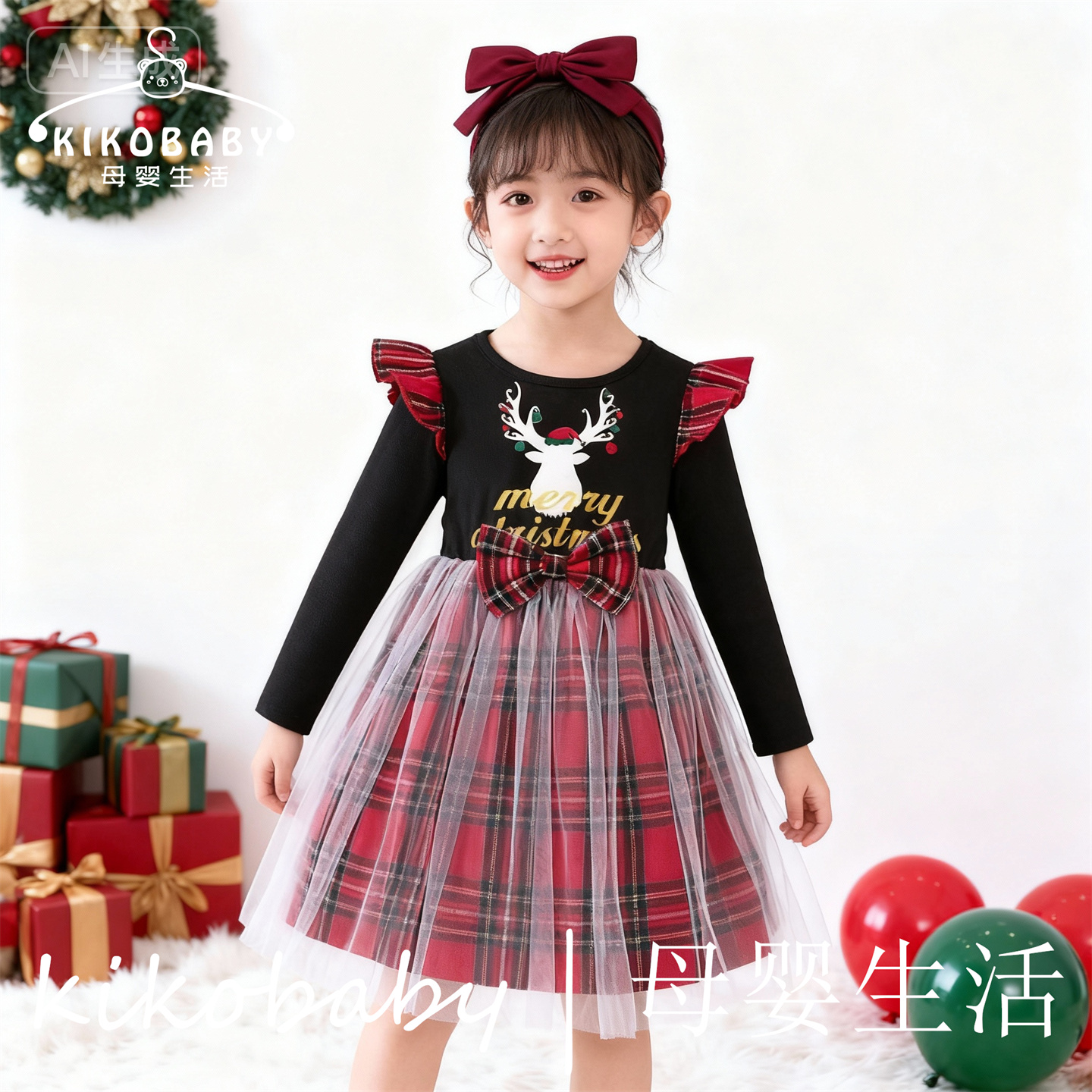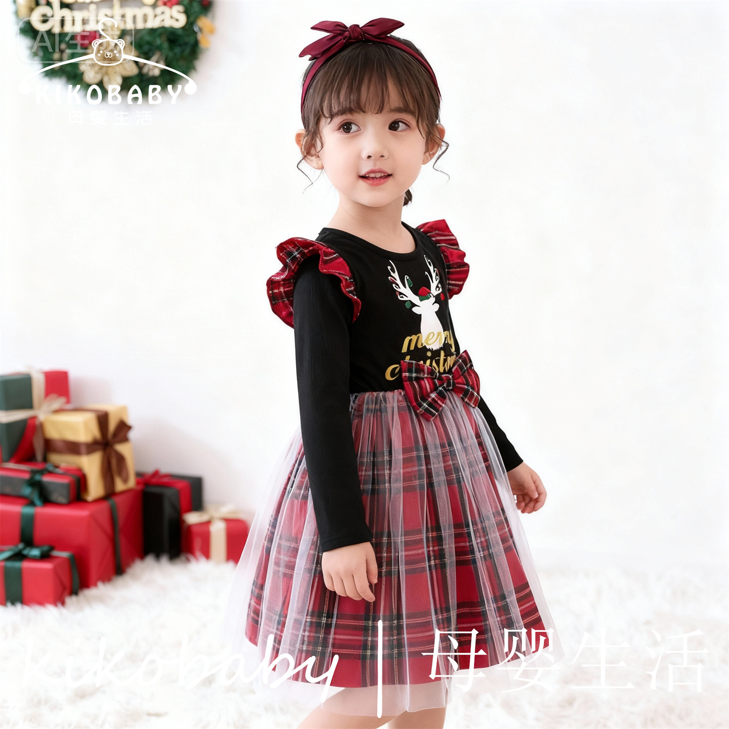 圣诞女童外贸童装 中小童女童秋冬新款圣诞节麋鹿网纱格子连衣裙