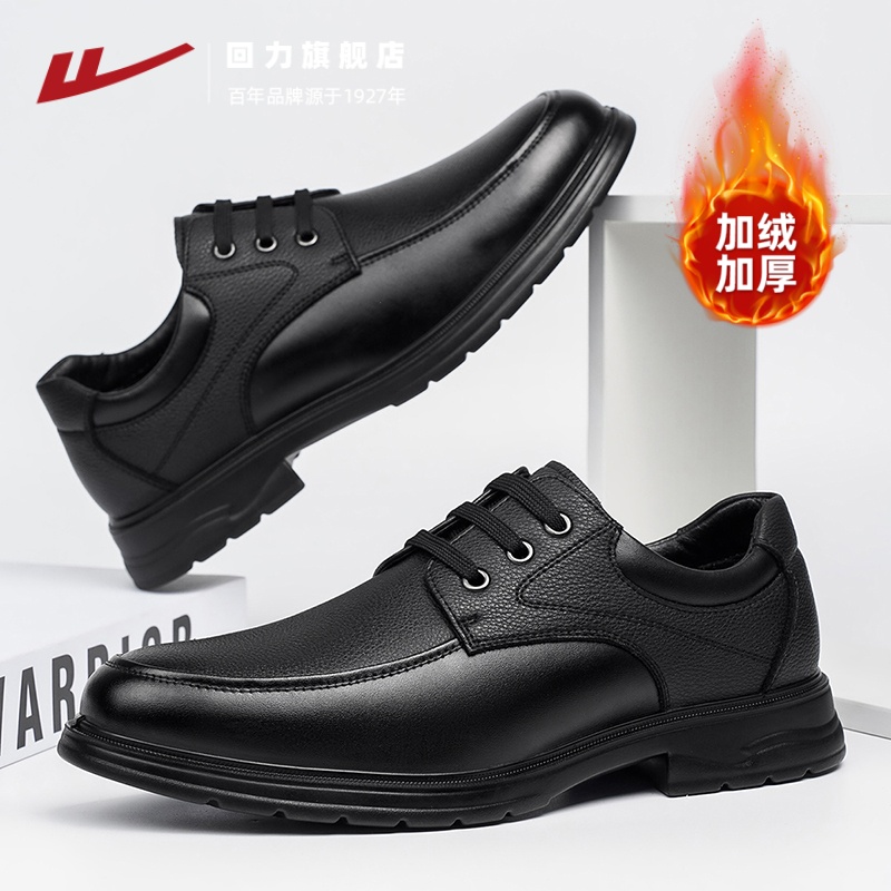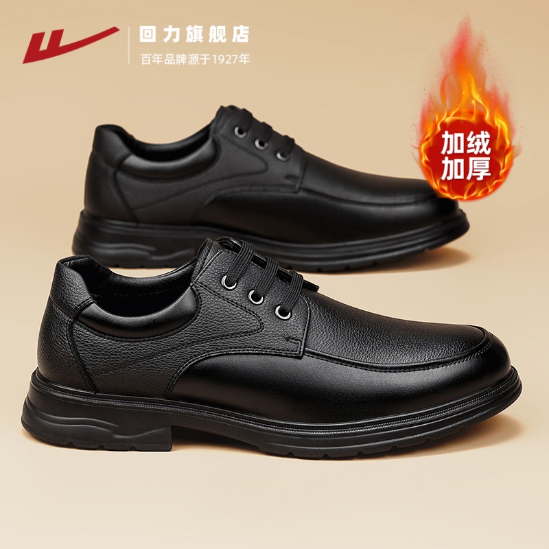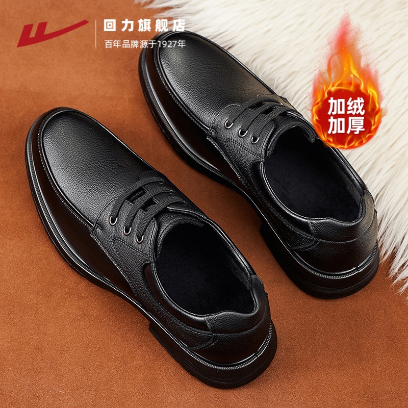 回力男鞋皮鞋加绒保暖冬季商务正装英伦风尖头德比爸爸中年人棉鞋