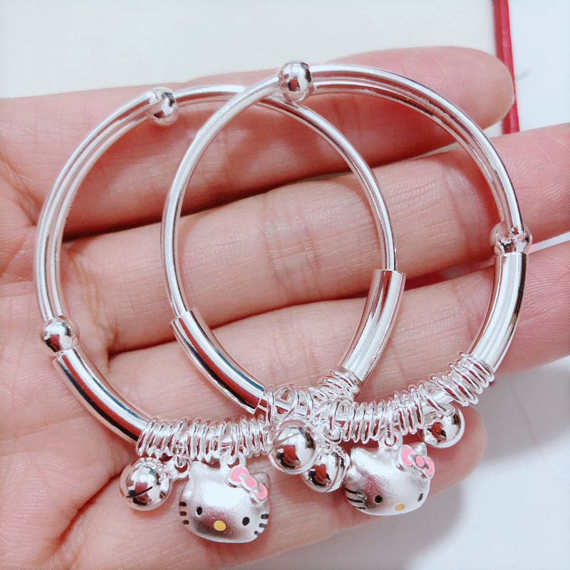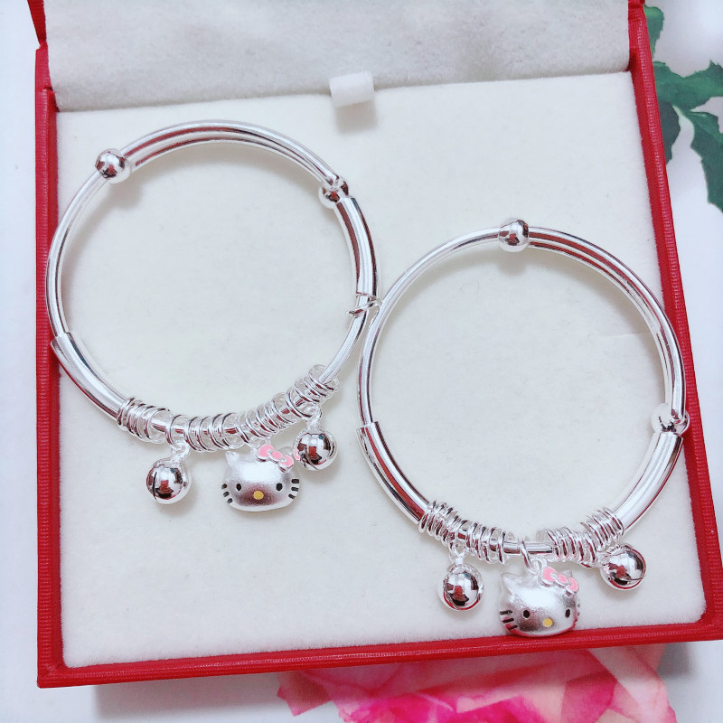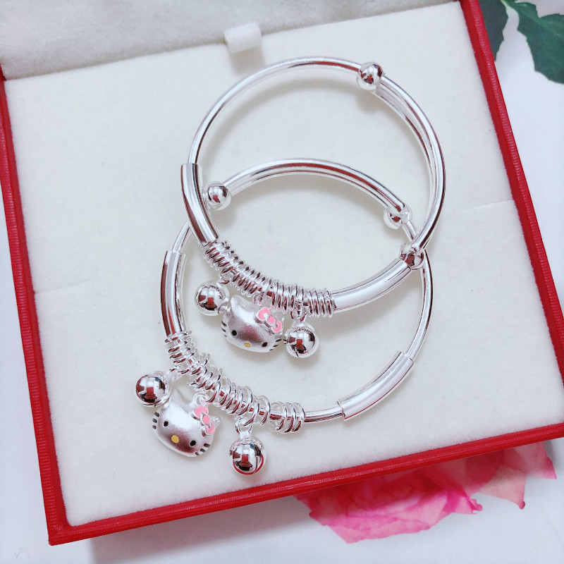 银饰香港正生纯银KT猫多圈推拉手镯足银999女可爱俏皮小公主宝宝