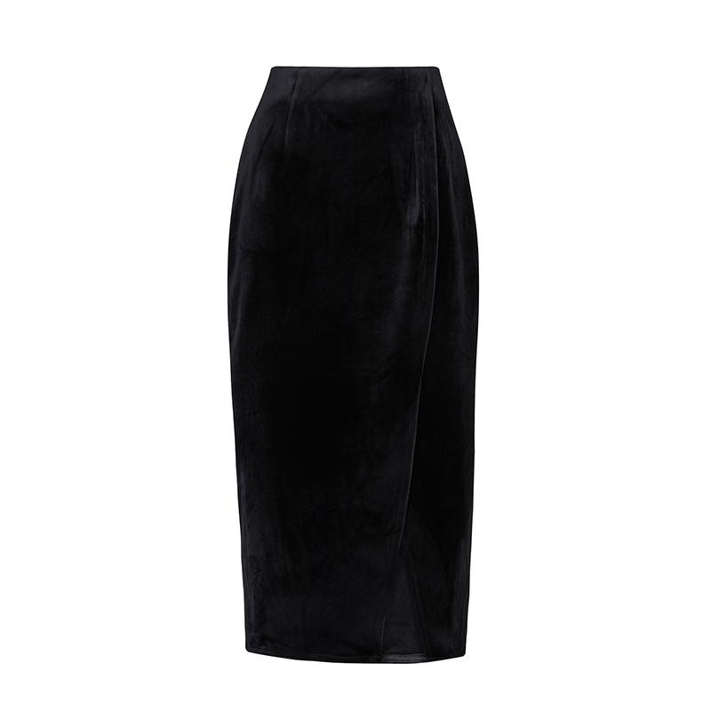Ching's法式复古高腰丝绒开衩半身裙 优雅郁金香花苞天鹅绒包臀裙