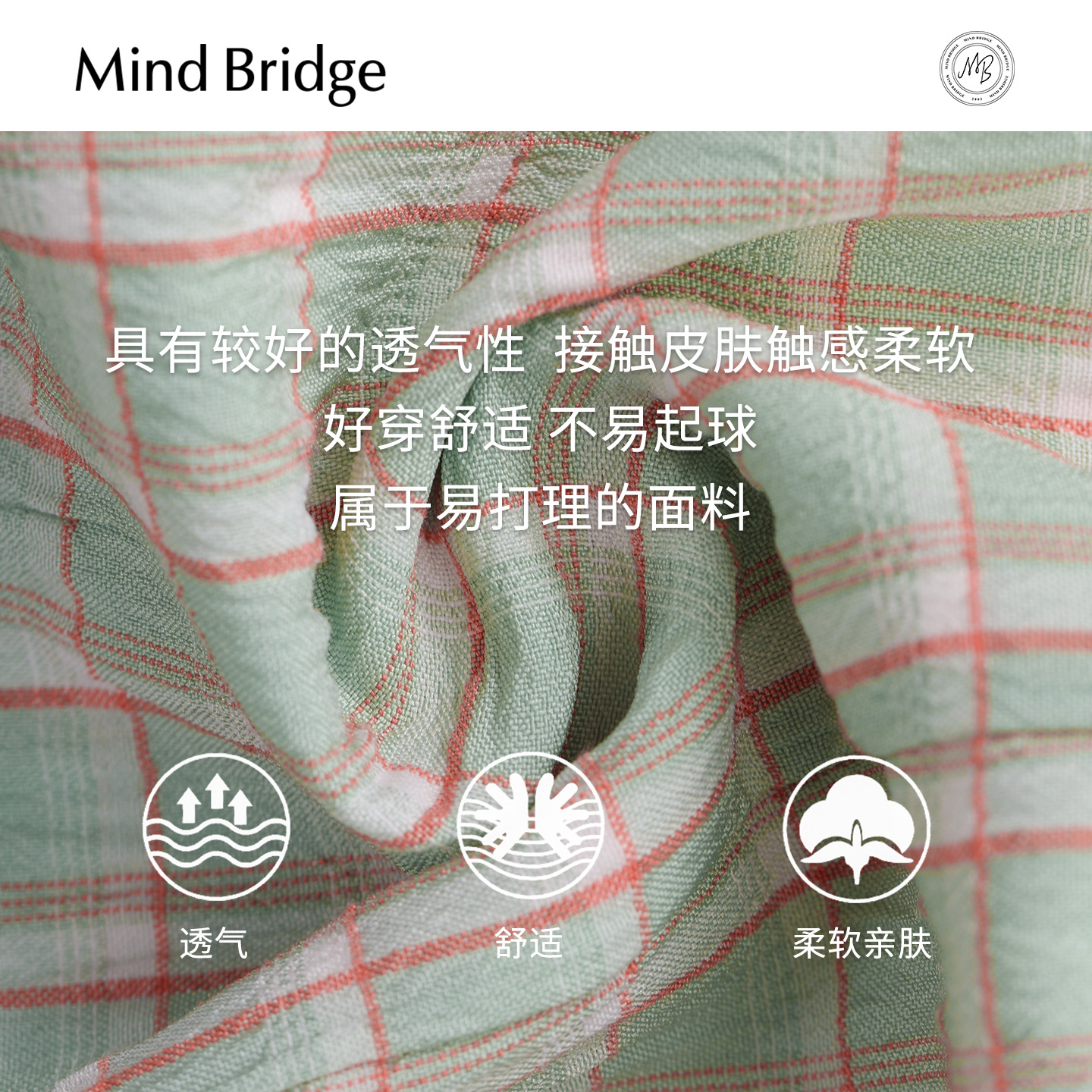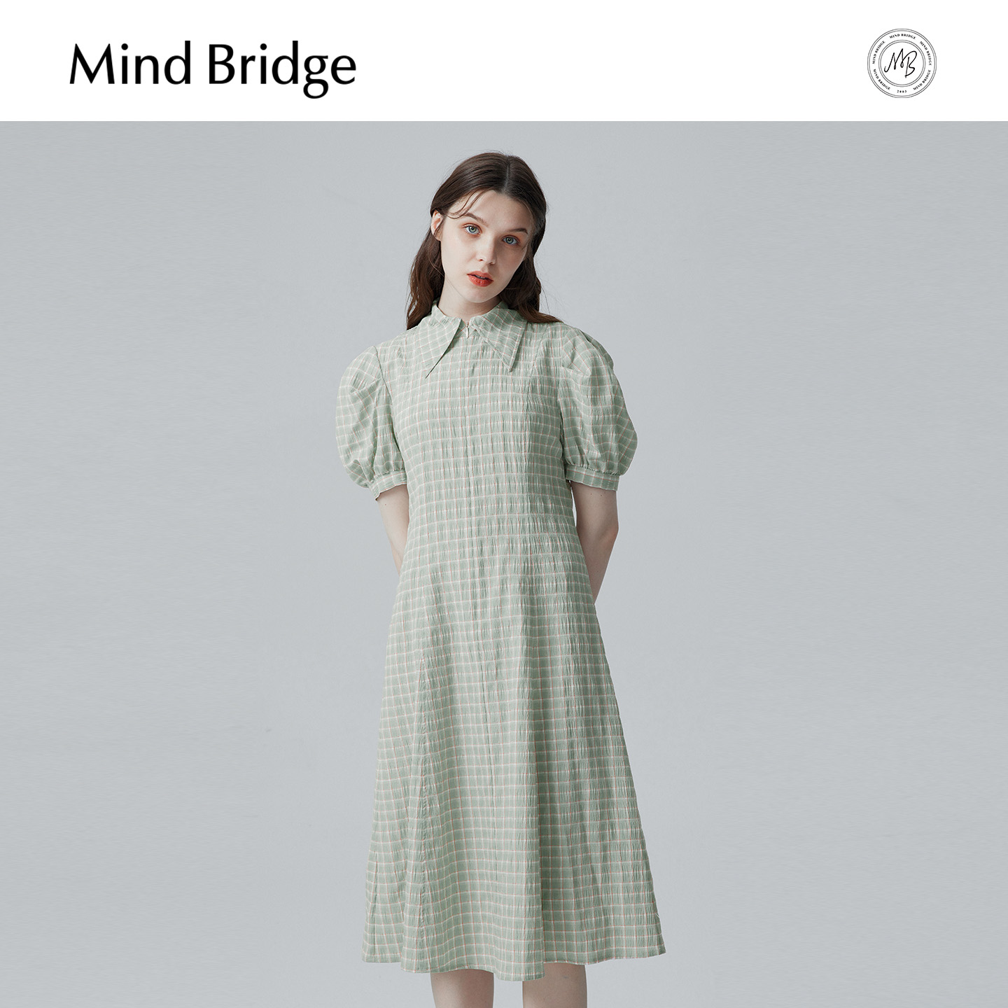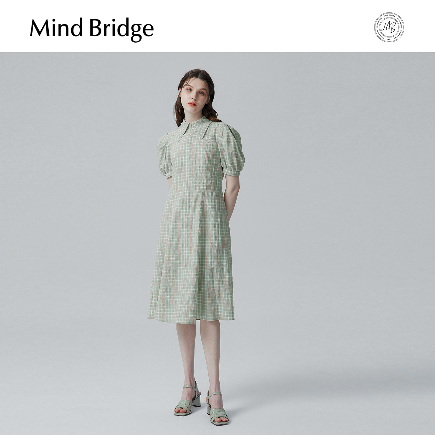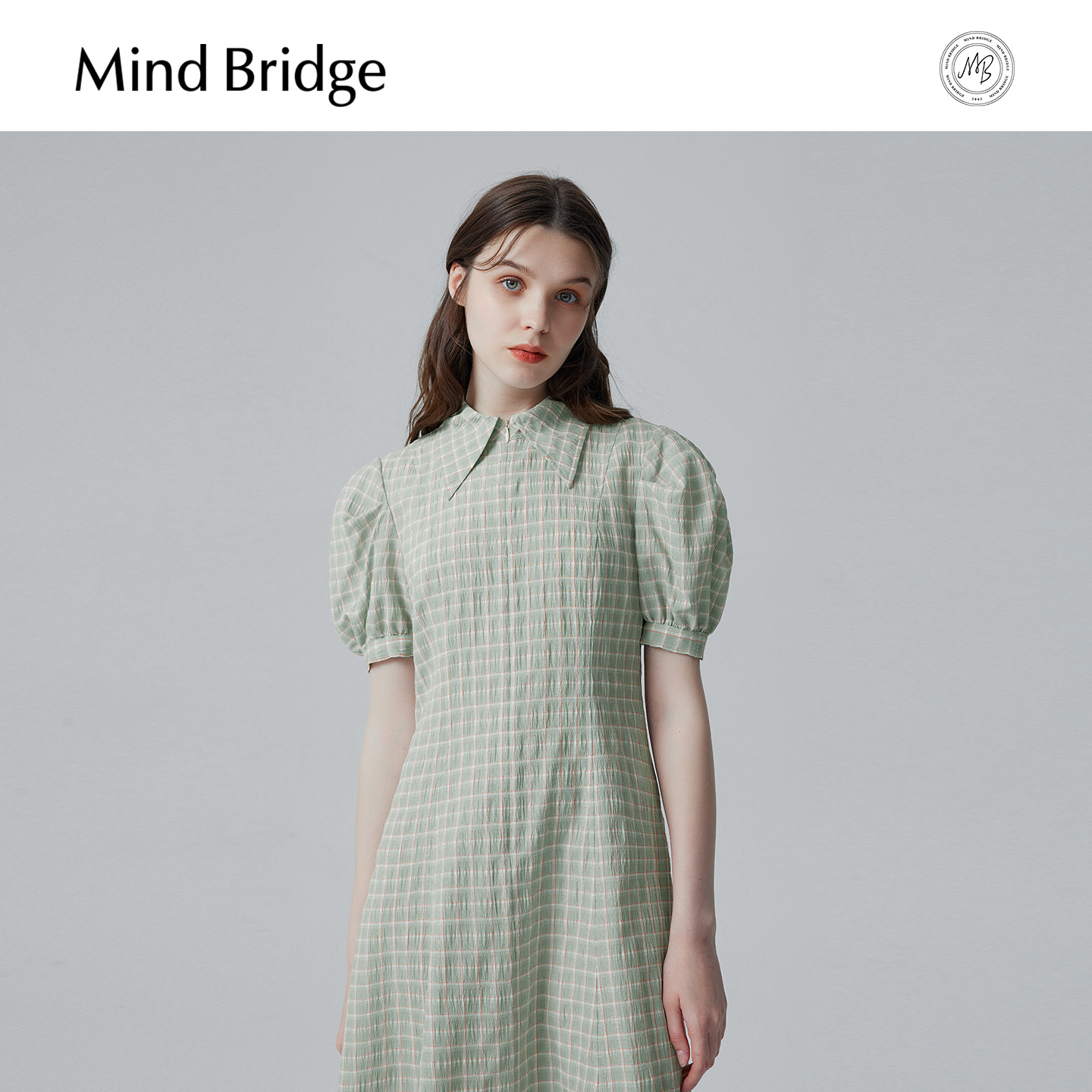 MB MindBridge百家好女士翻领连衣裙夏季新品格纹裙子泡泡袖长裙