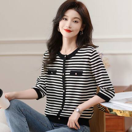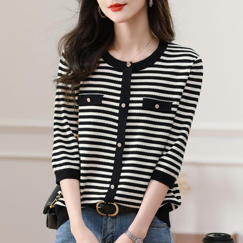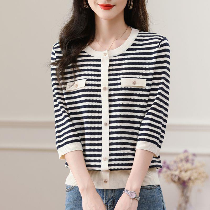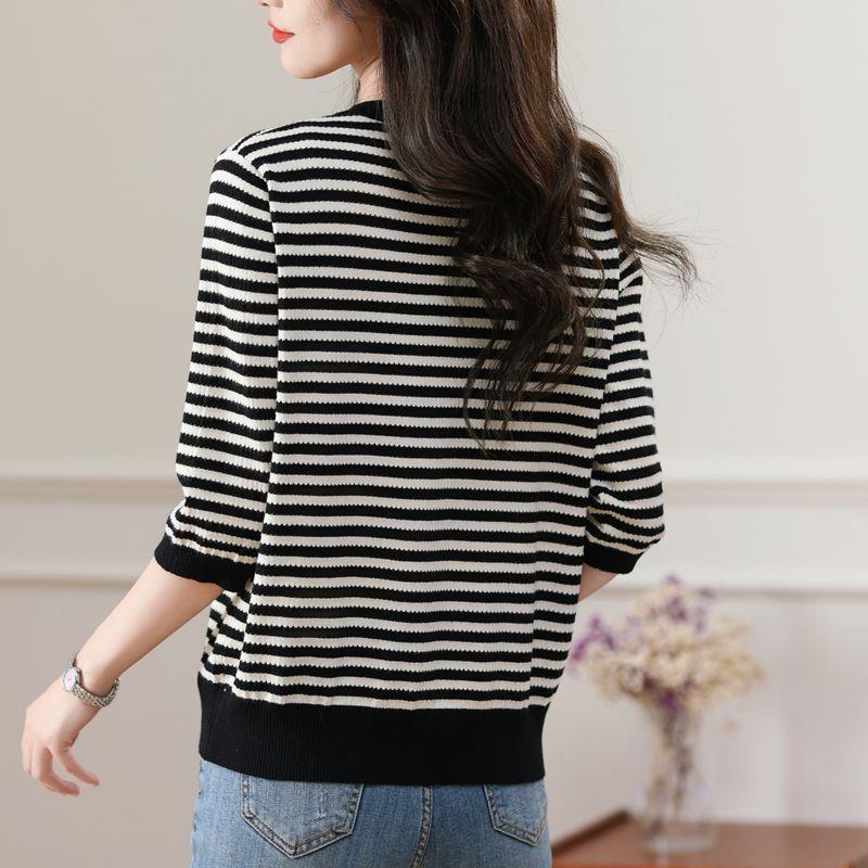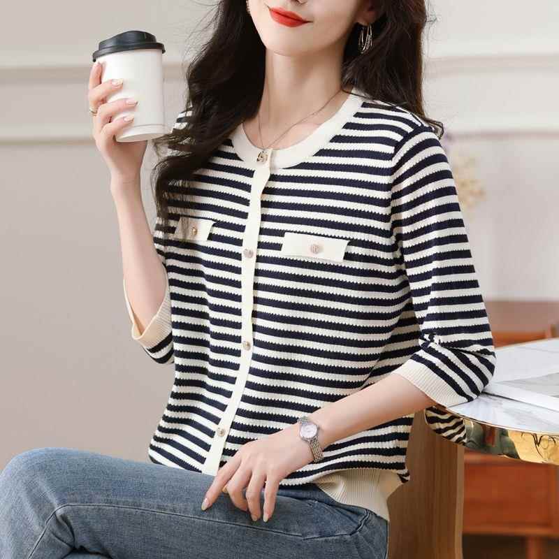2024年秋季新款冰丝七分袖圆领条纹套头针织衫小香风宽松洋气上衣