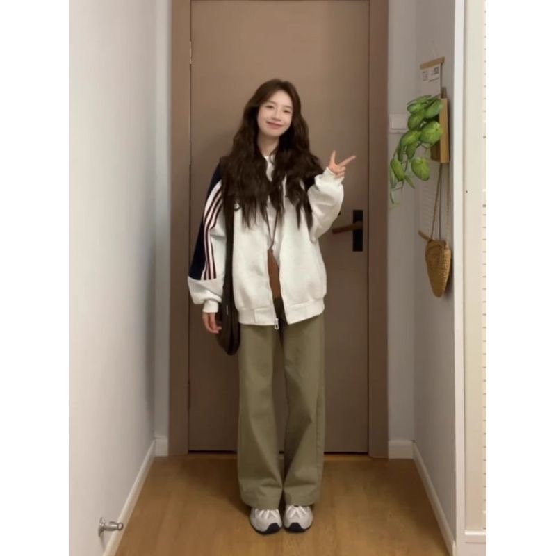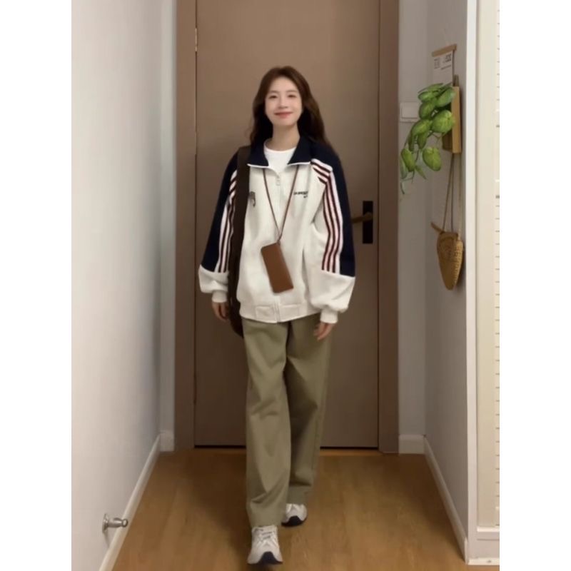 条纹美式复古撞色拉链外套女春秋薄款宽松慵懒风棒球服开衫卫衣潮