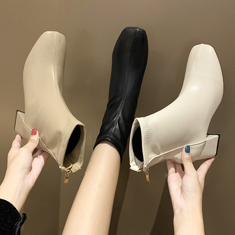 方头秋季韩版百搭后拉链粗跟短靴