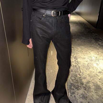 子上男装秋冬暗黑涂层牛仔裤直筒喇叭裤水洗渐变黑灰色设计感阔腿