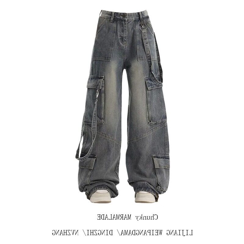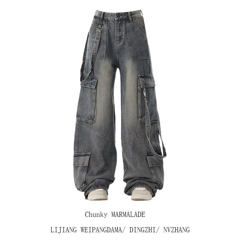 大码美式高街工装牛仔裤女2025新款多口袋直筒阔腿宽松拖地长裤子