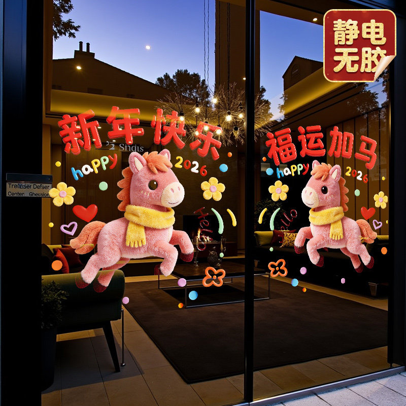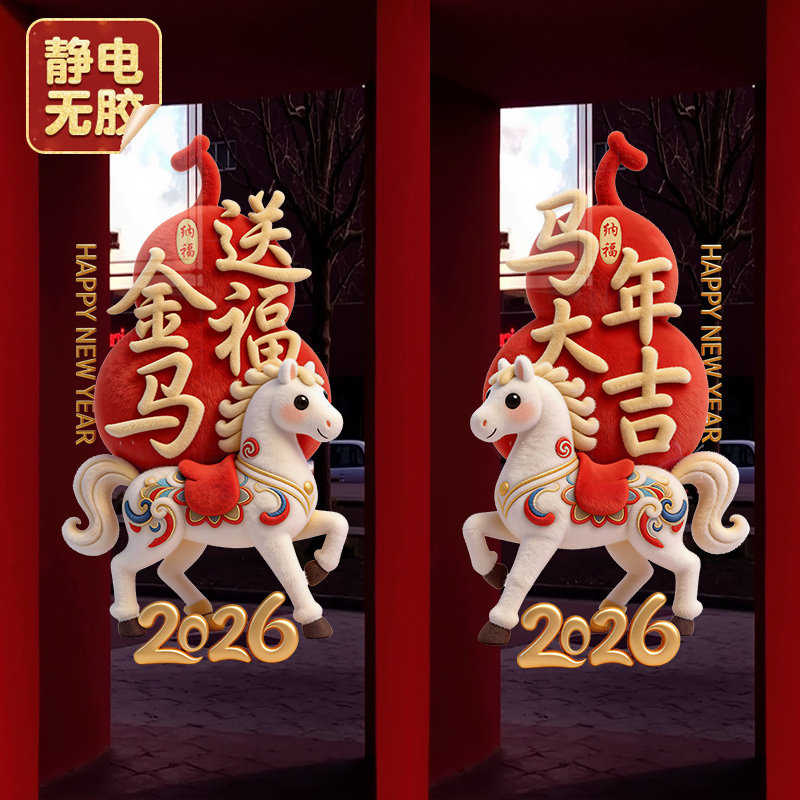 马年窗花2026新年玻璃门贴纸整张毛绒窗贴春节过年布置静电贴装饰