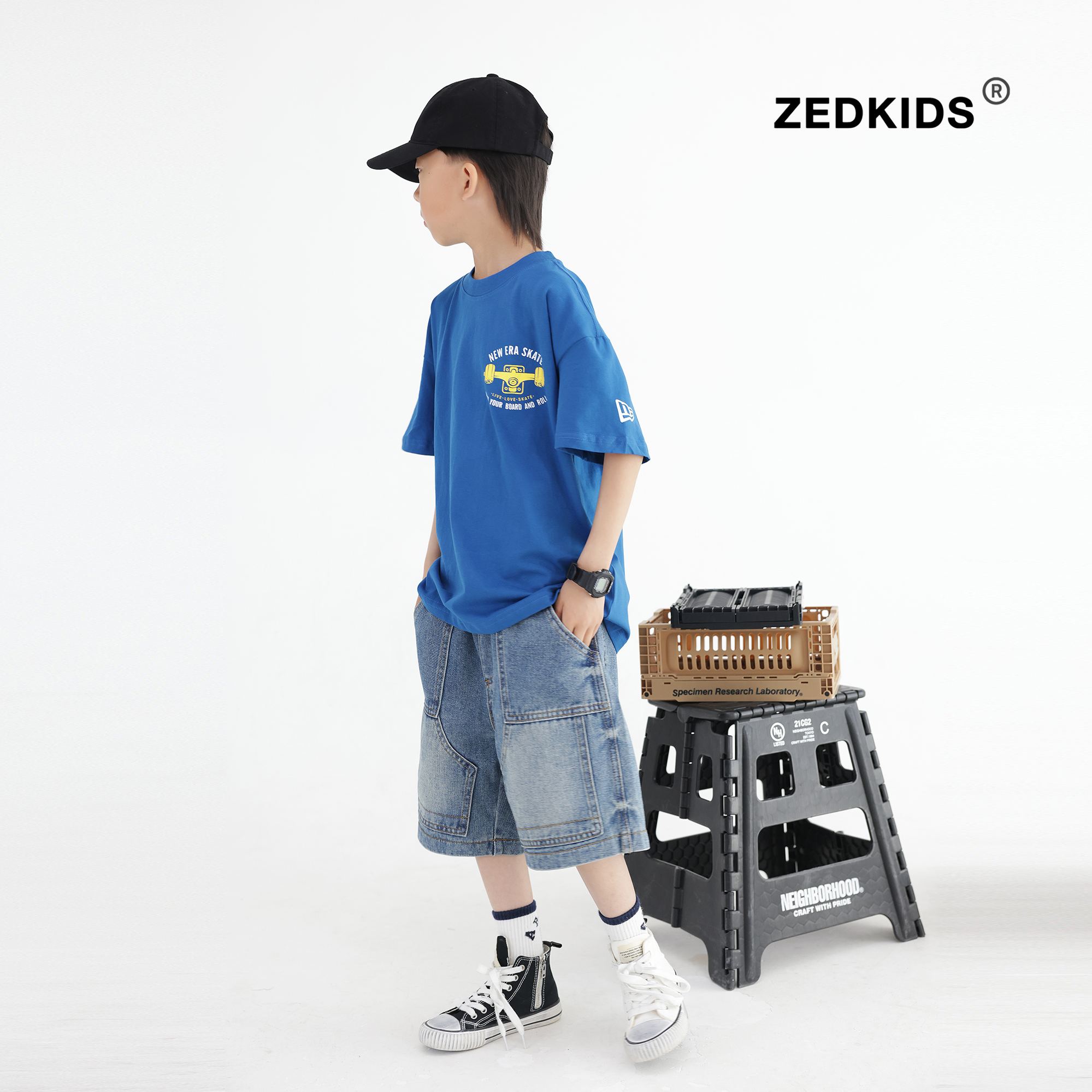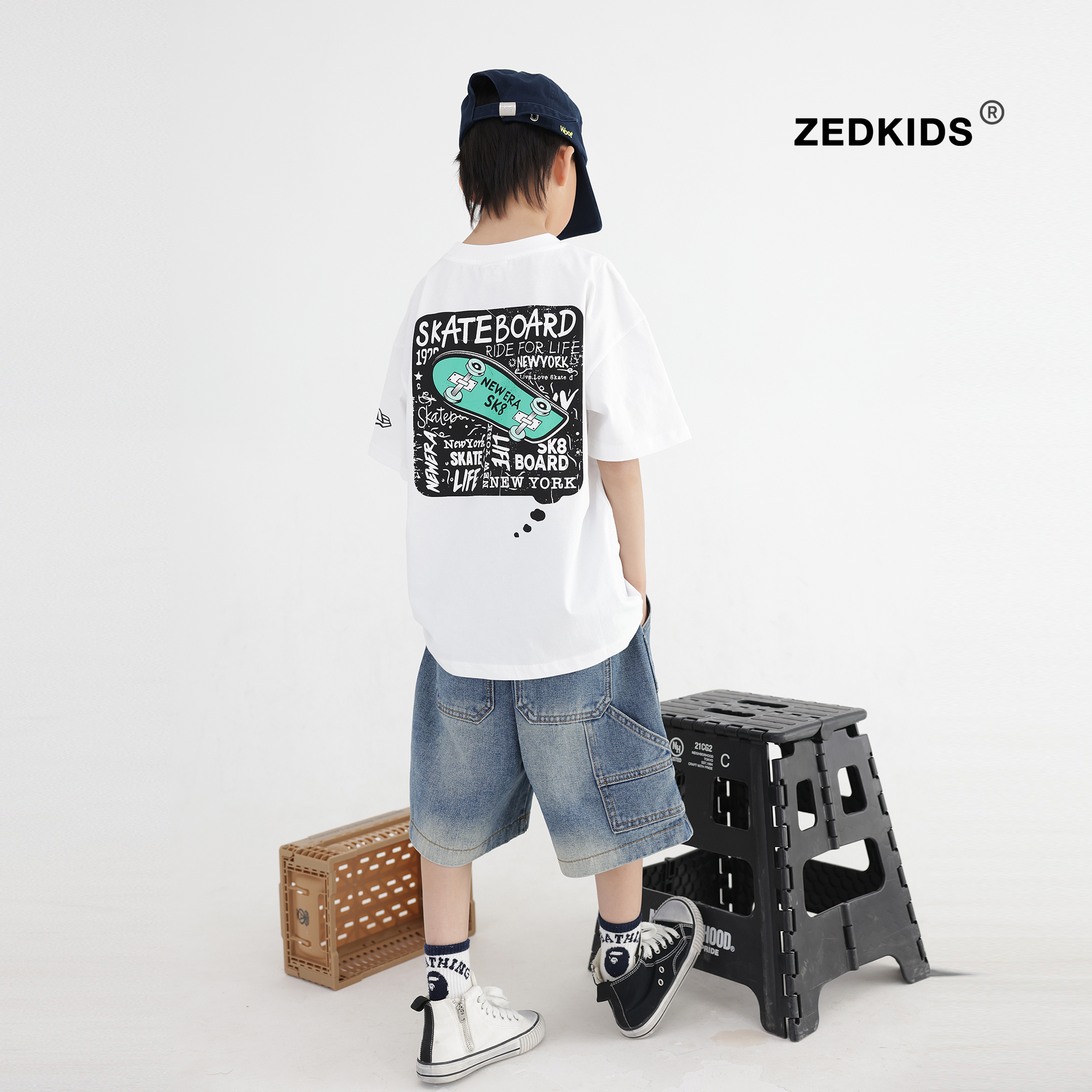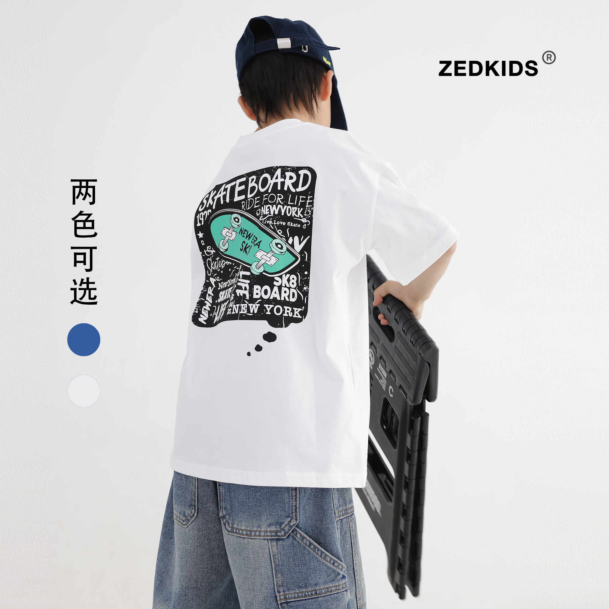 张恩朵童装潮酷男童夏装半袖帅气男孩滑板印花纯棉短袖T恤中大童