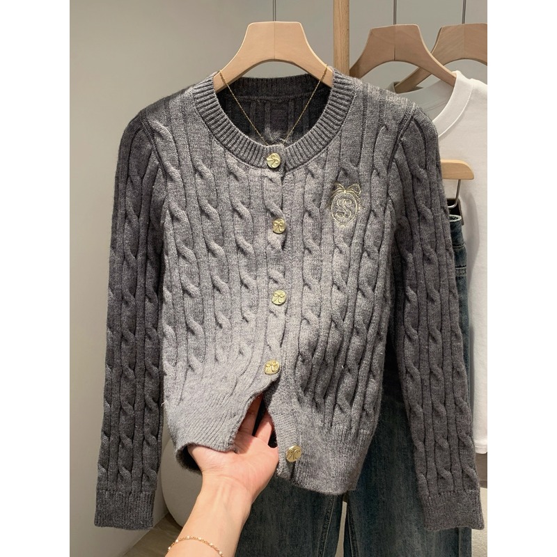 灰色小香风麻花长袖针织毛衣开衫加厚外套女2025秋冬独特修身上衣