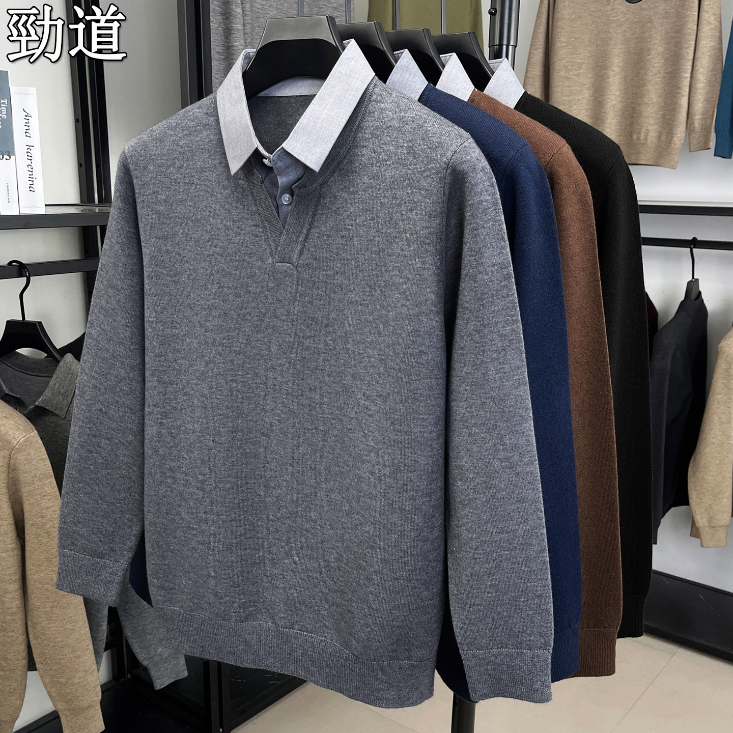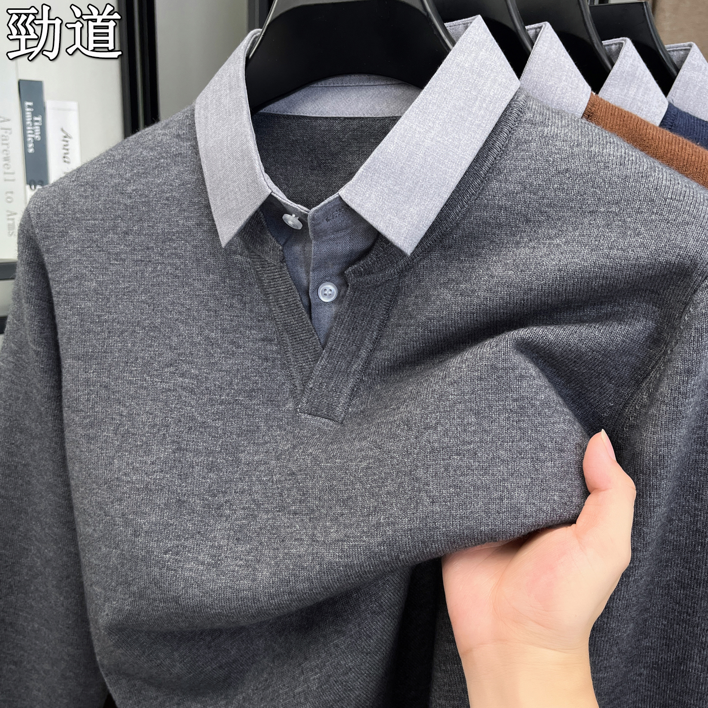 劲道男士假两件针织衫冬季加厚保暖打底衫时尚休闲衬衫领男装毛衣