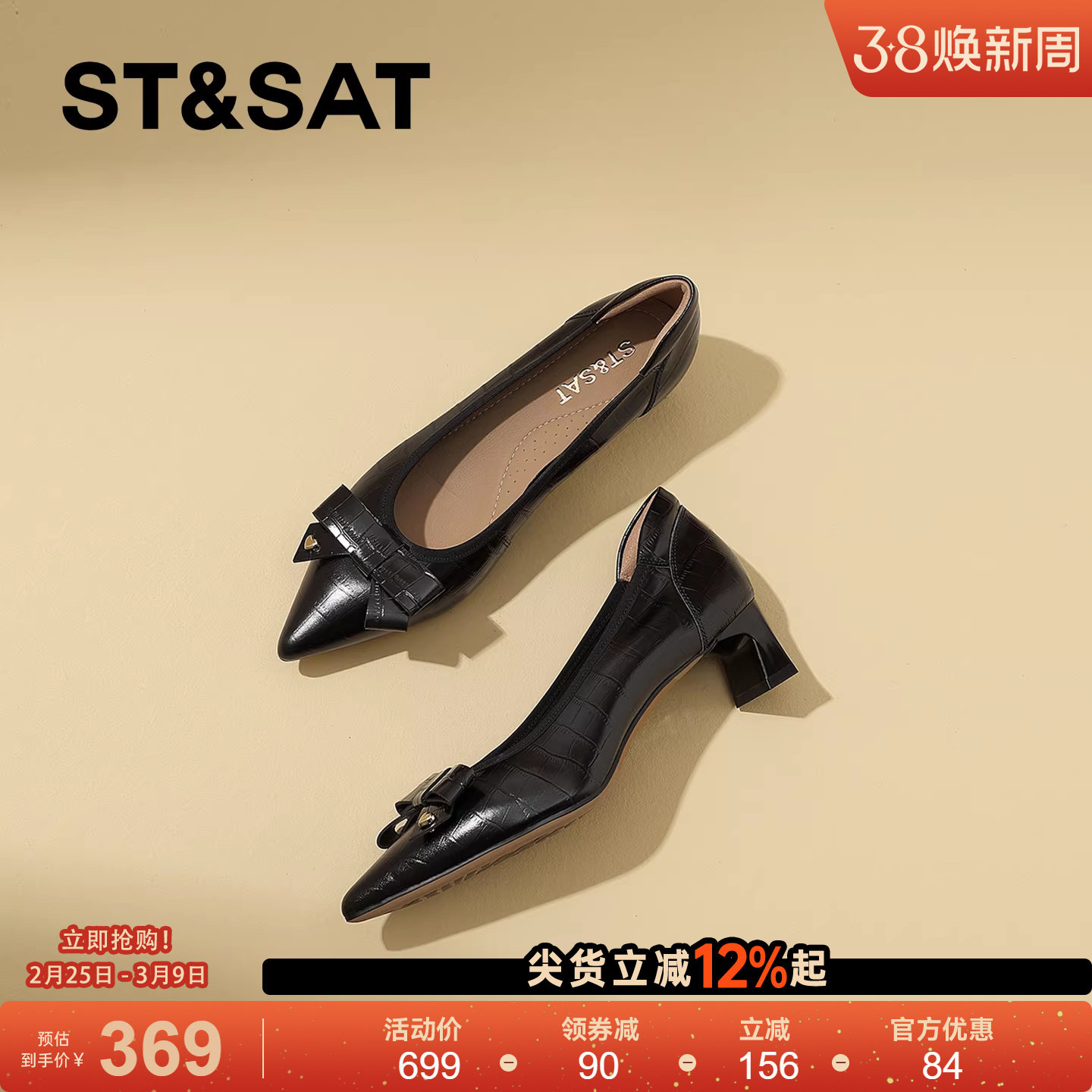 星期六法式尖头粗跟浅口单鞋