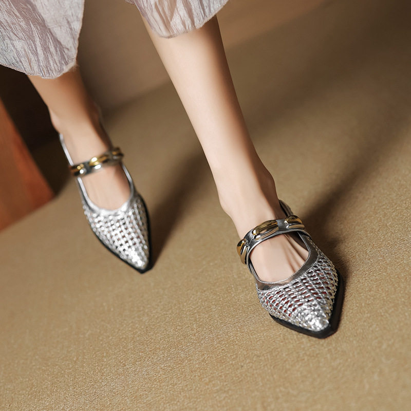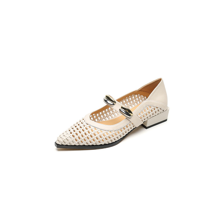 3cm时尚粗跟镂空凉鞋法式优雅洞洞单鞋女方头中跟一字带编织百搭