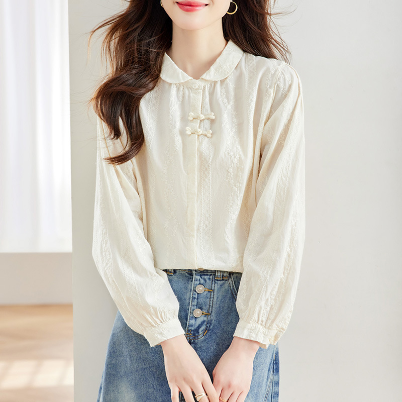 娃娃领纯棉长袖衬衫女2025秋季新款中国风盘扣衬衣宽松百搭上衣潮