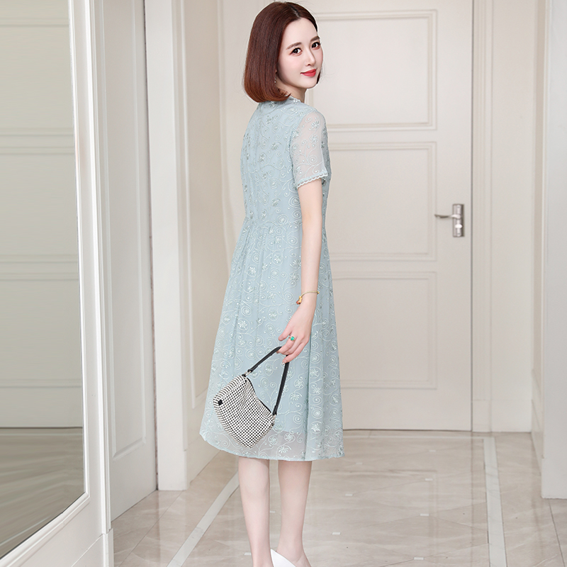 新款真丝连衣裙刺绣夏季短袖真丝