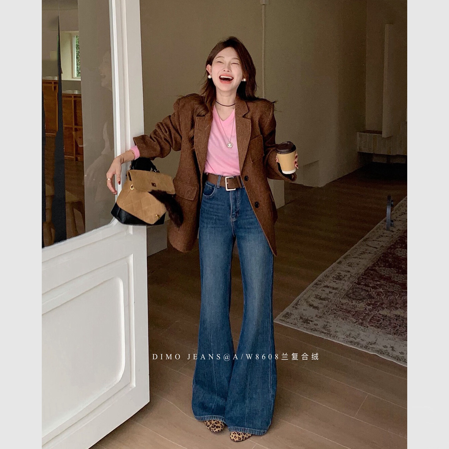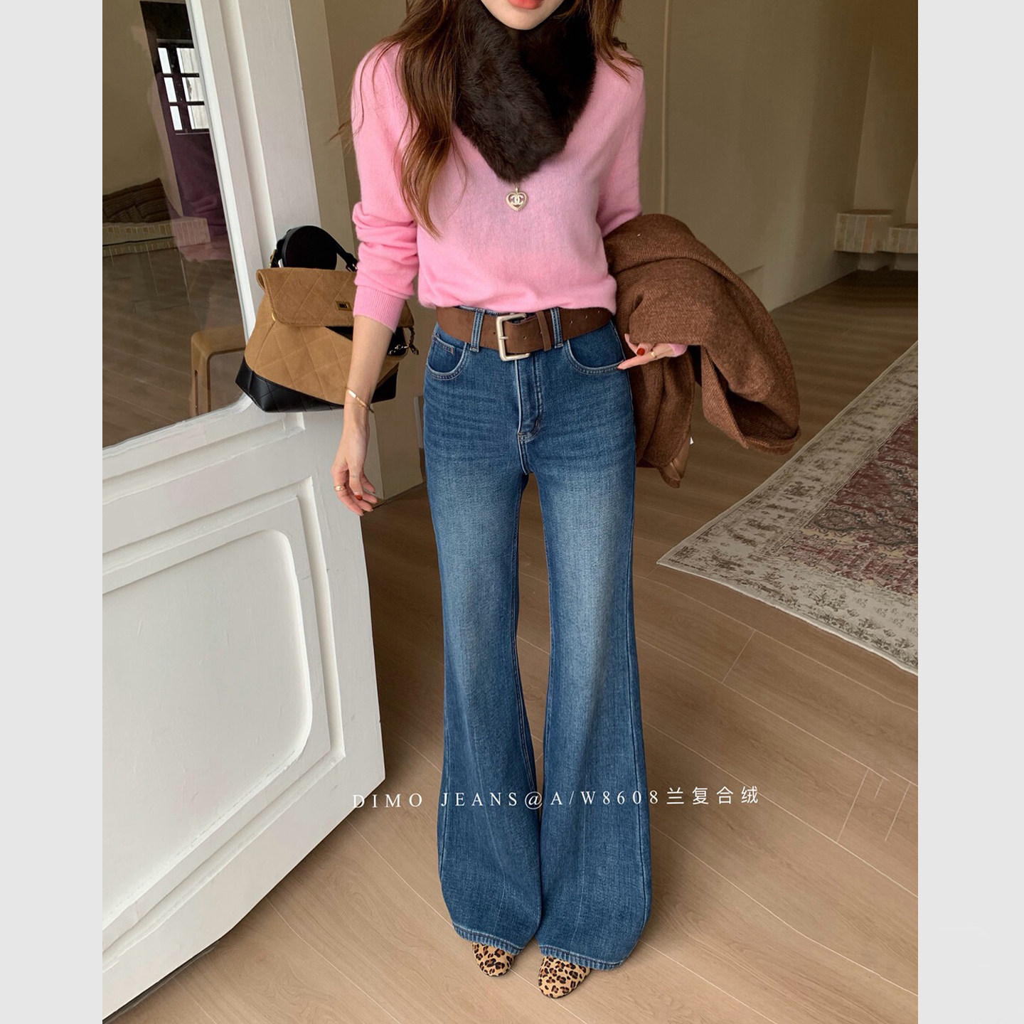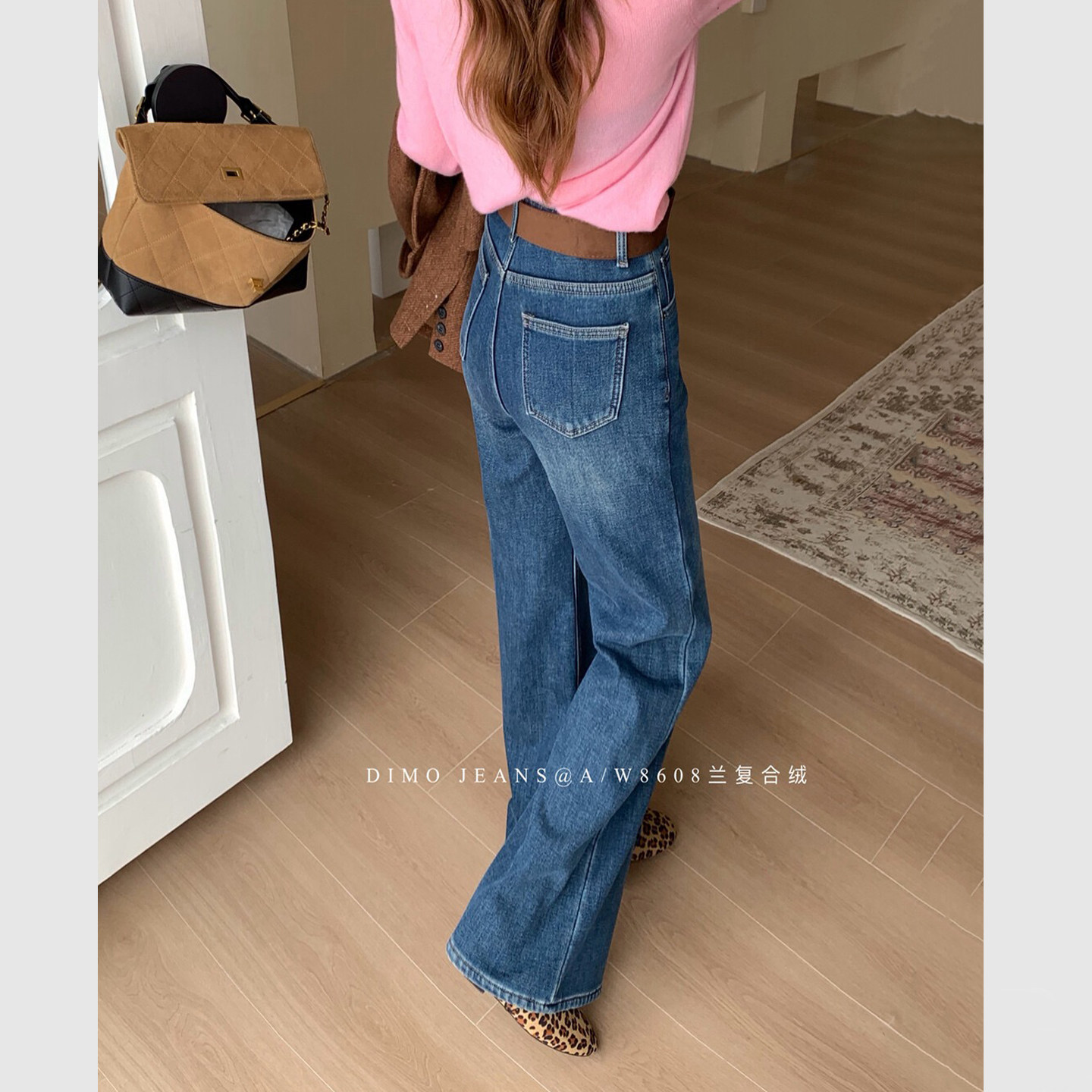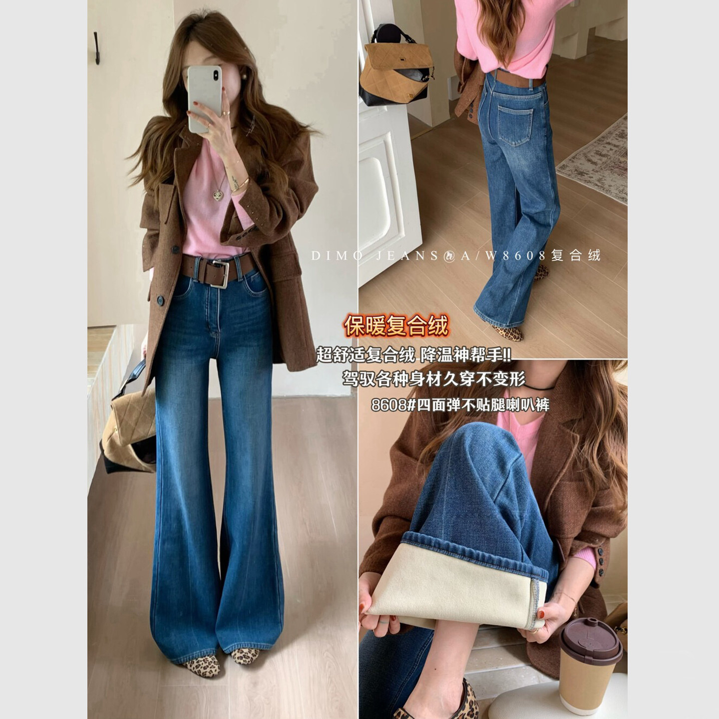 DIMO蓝色微喇牛仔裤女2025新款冬加绒加厚高腰不贴腿喇叭裤8608