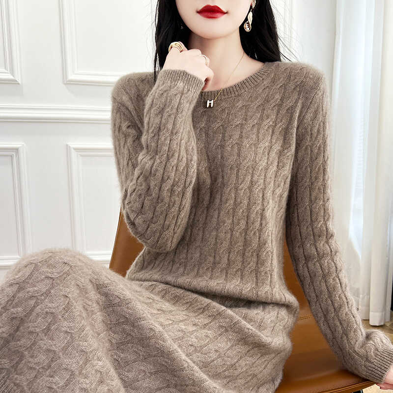 圆领扭花100%纯羊毛衫连衣裙女中长款针织衫毛衣裙宽松羊绒衫长裙