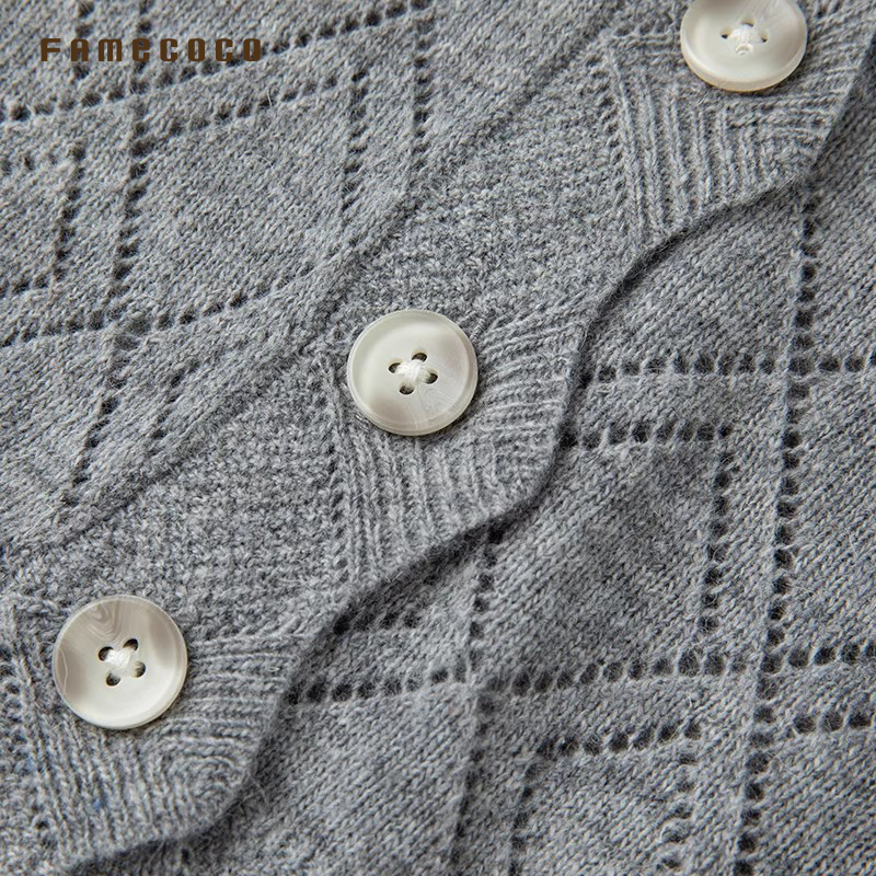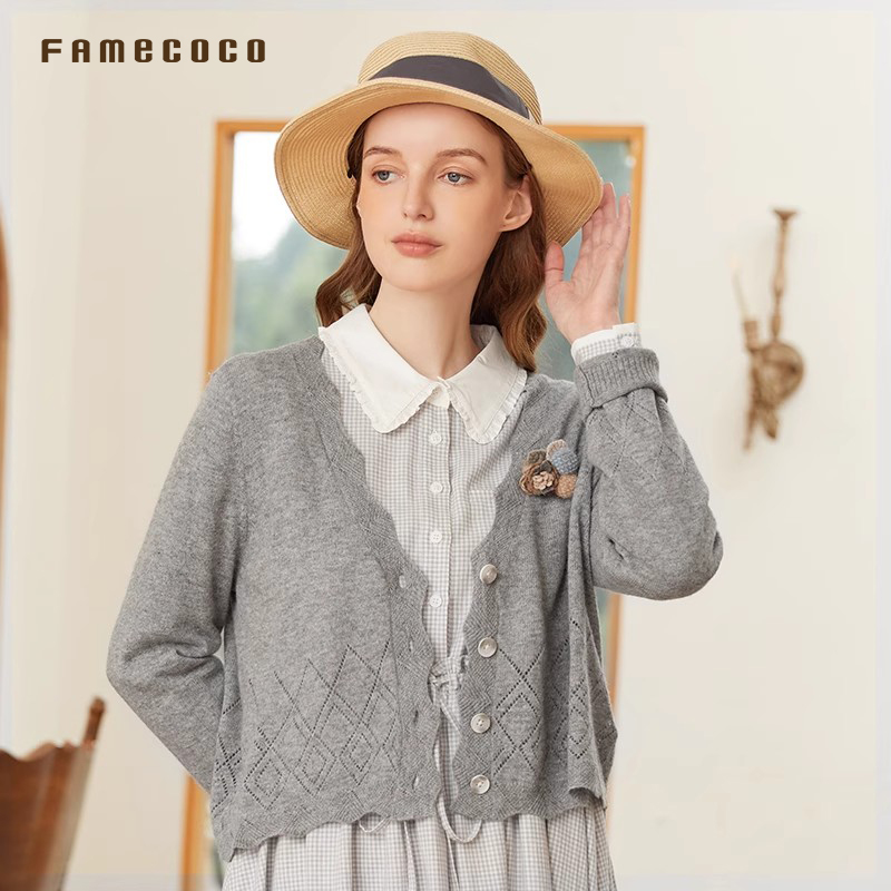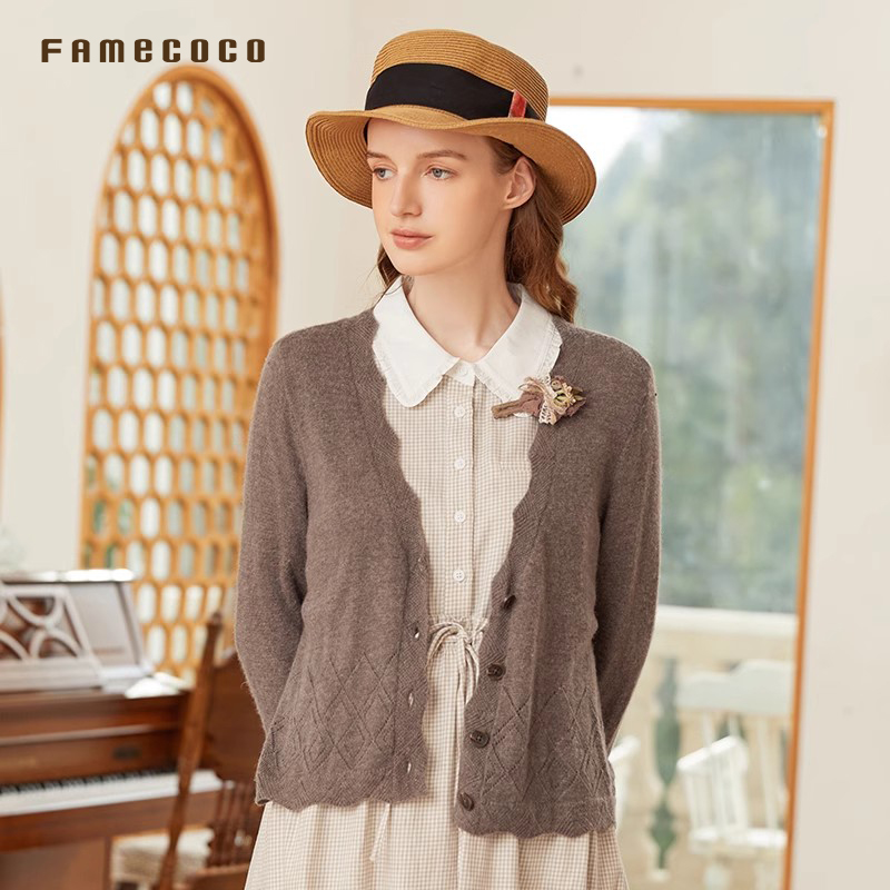 Famecoco商场同款针织毛衣开衫V领菱形文艺通勤长袖女FAB1DE002