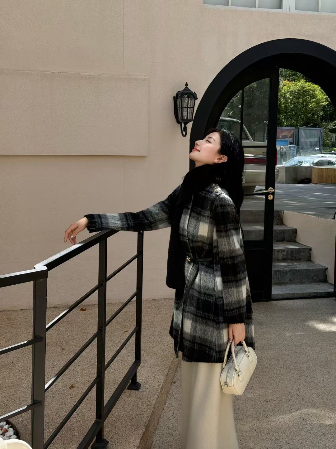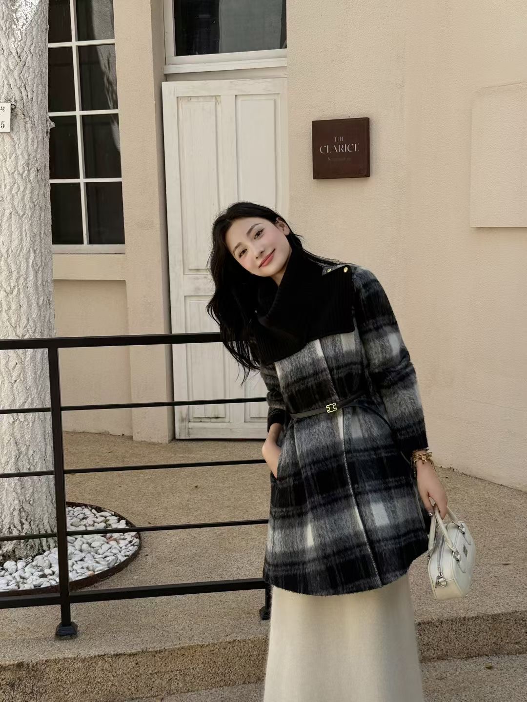 韩国秋冬可脱卸披肩斗篷格子双面羊绒大衣女中长款宽松羊毛呢外套