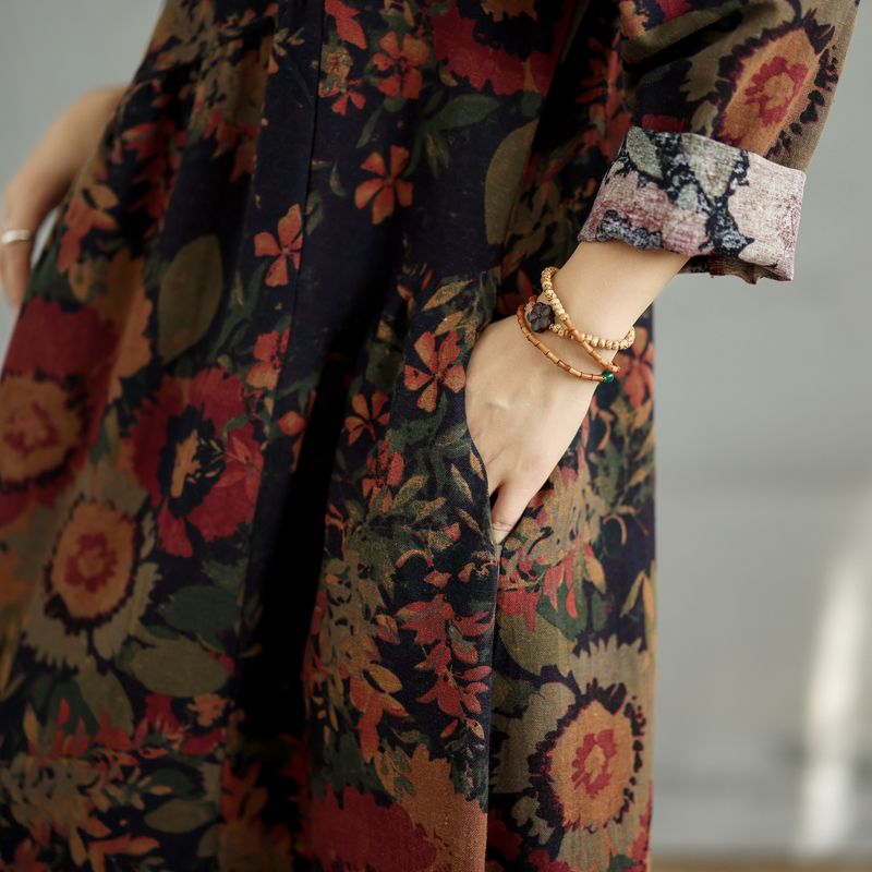 复古棉麻印花长袖连衣裙女春秋季大码胖mm气质收腰显瘦大摆长裙子