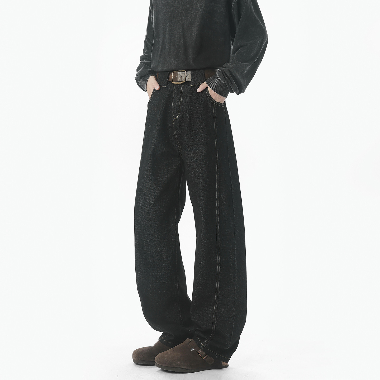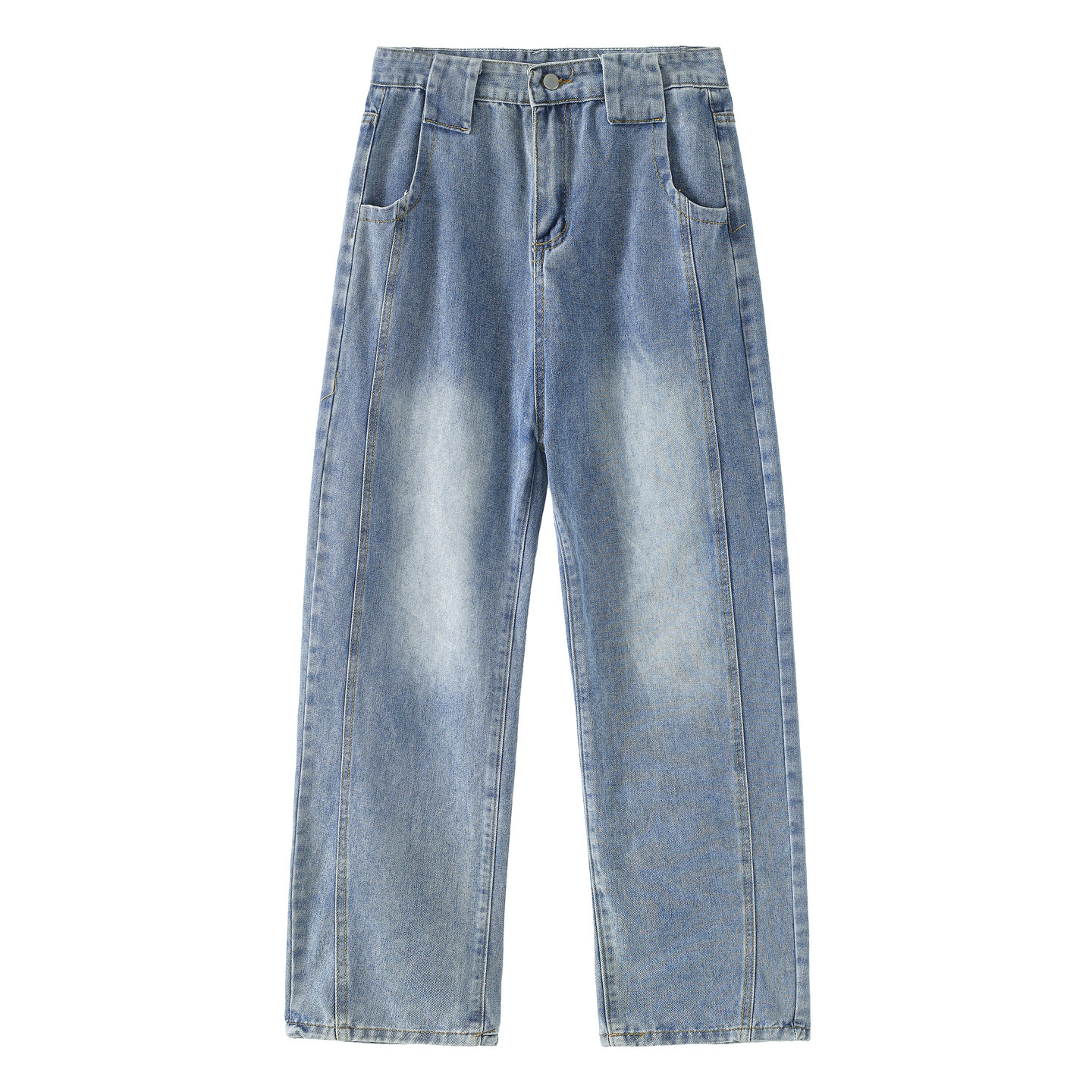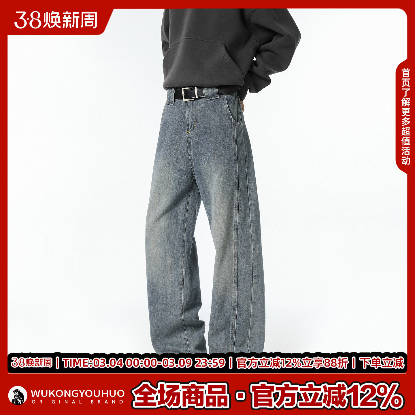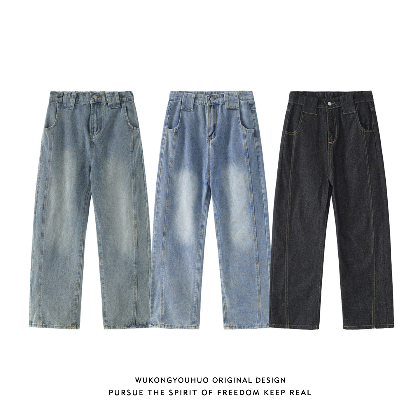 悟空有货潮牌美式水洗做旧拼接直筒牛仔裤男宽松潮流阔腿百搭长裤