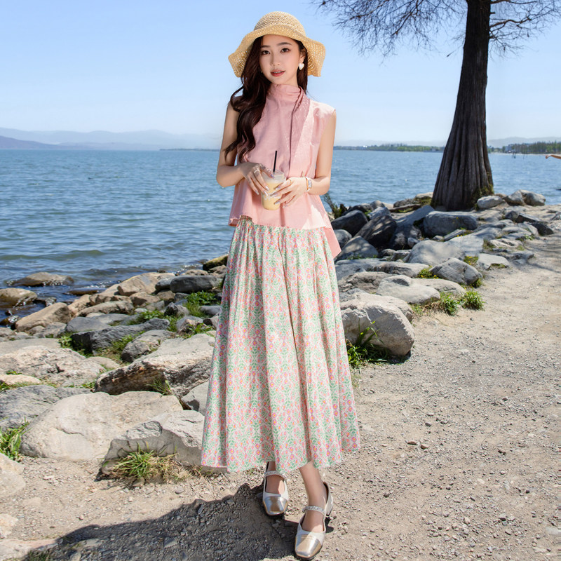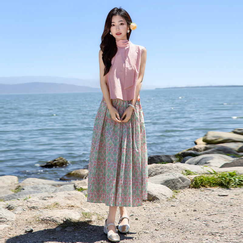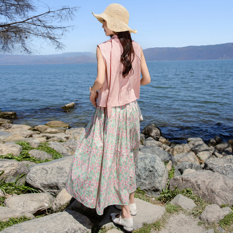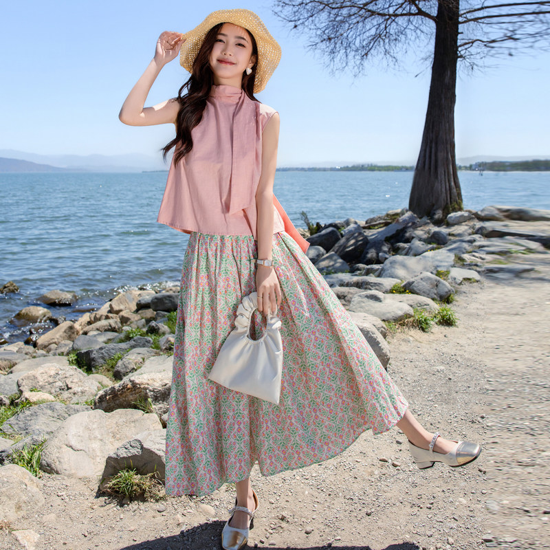 无袖上衣搭配碎花半身裙两件套