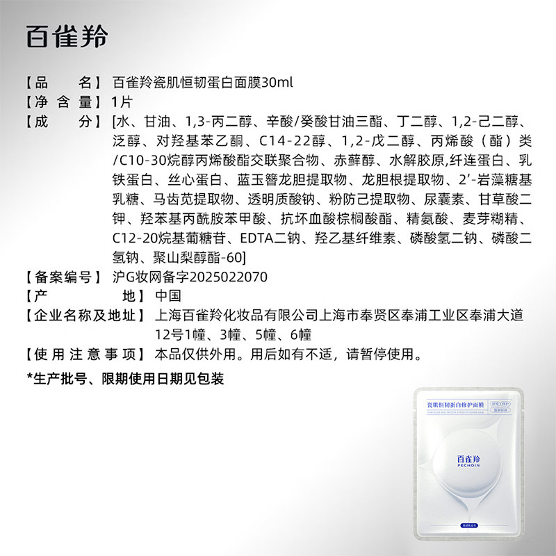 【体验装】百雀羚瓷肌恒韧蛋白修护面膜保湿滋润舒缓护肤2片装