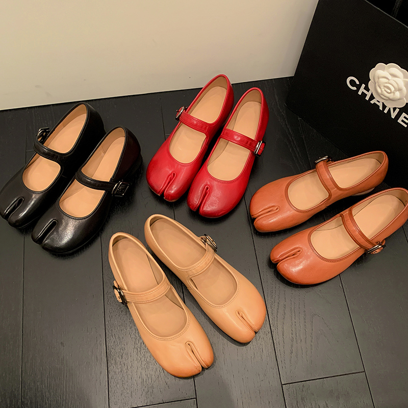 头层羊皮分趾鞋玛丽珍复古猪蹄粗跟单鞋红色浅口低跟芭蕾舞鞋女鞋