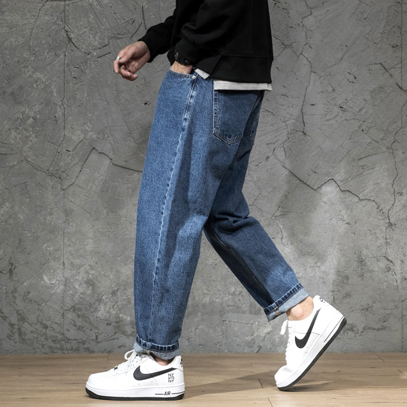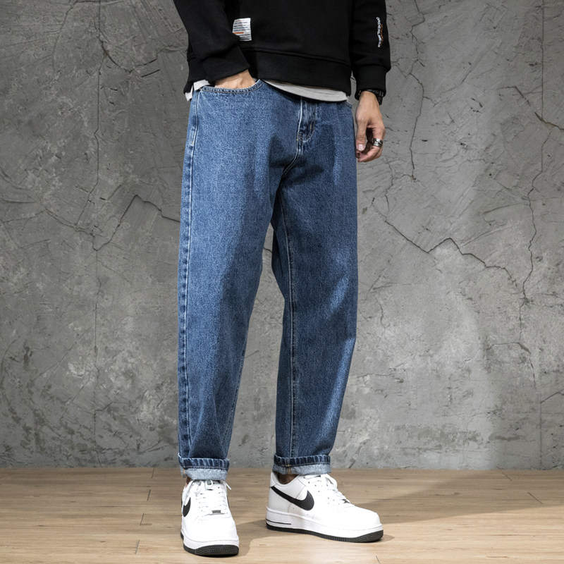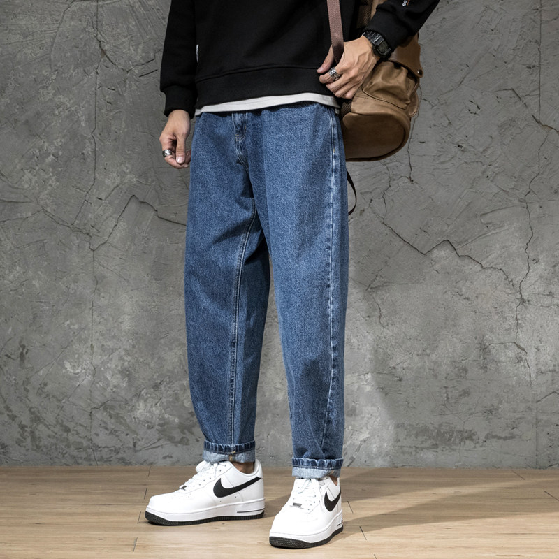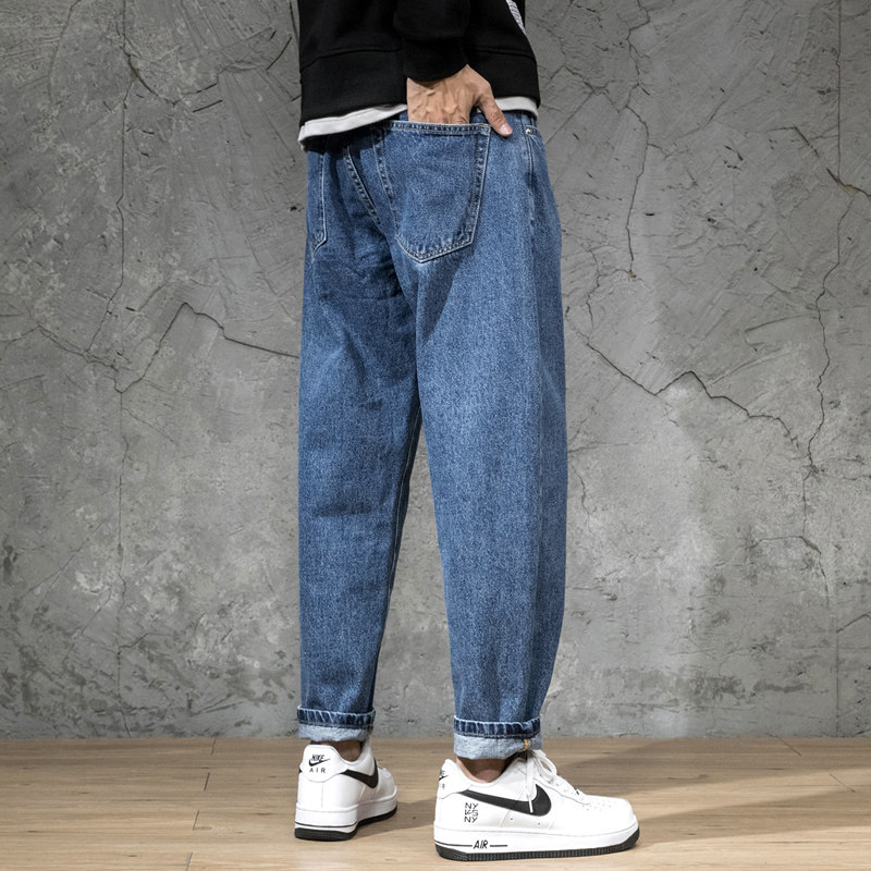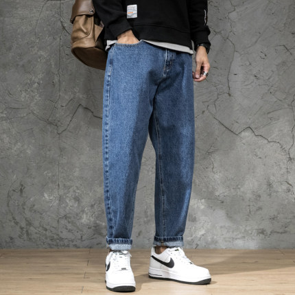 春季潮牌男士牛仔裤男宽松大码小脚哈伦裤ins简约休闲直筒裤子男